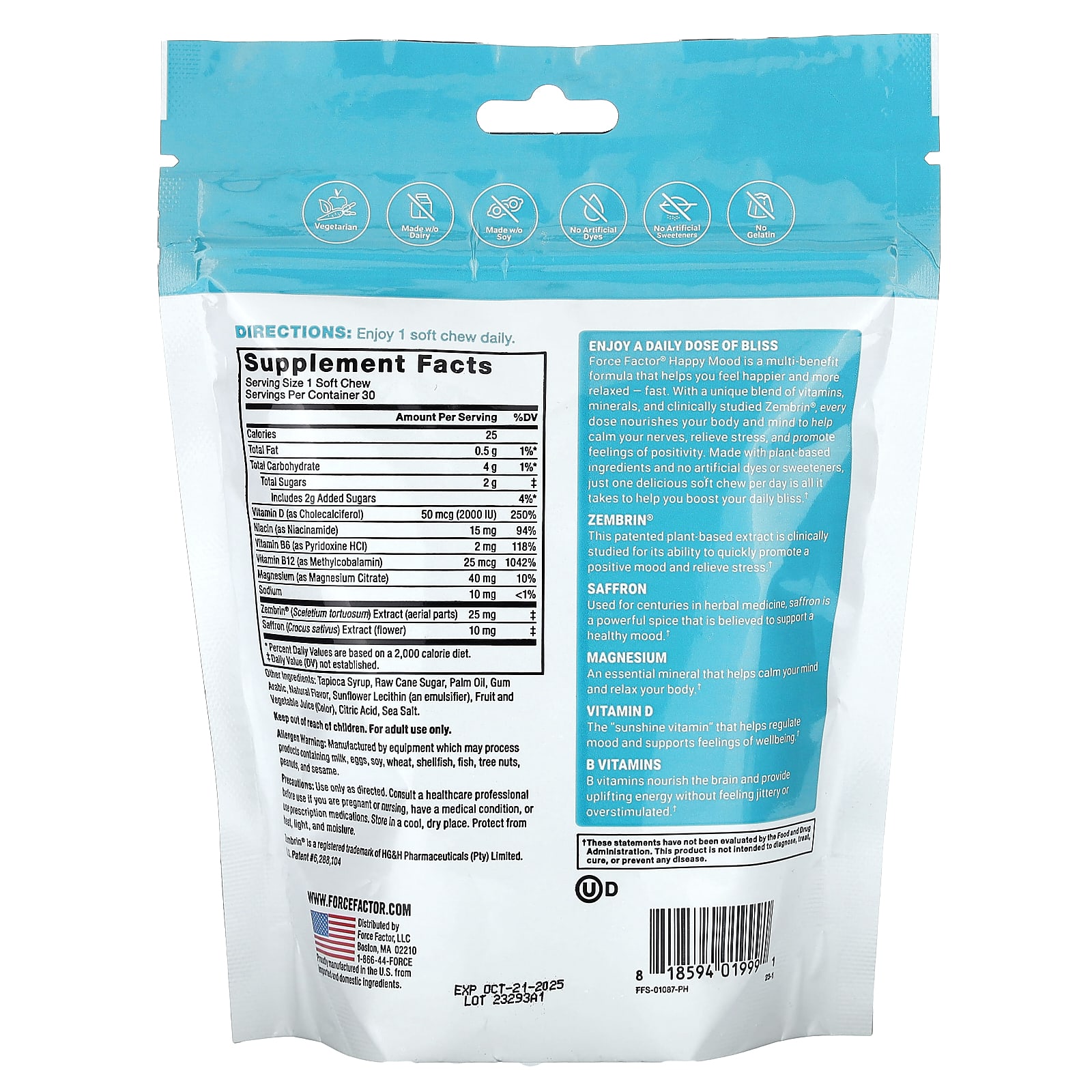 Happy Mood da Force Factor® é uma fórmula multiBenefícios que ajuda você a se sentir mais feliz e relaxado – e rapidamente. Com uma mistura única de vitaminas, minerais e Zembrin® clinicamente estudado, cada dose nutre o corpo e a mente para ajudar a acalmar os nervos, aliviar o estresse e promover uma sensação positiva. Feito com ingredientes à base de plantas e sem corantes ou adoçantes artificiais, apenas uma deliciosa cápsula mastigável por dia é o suficiente para ajudar você a aumentar sua felicidade diária.