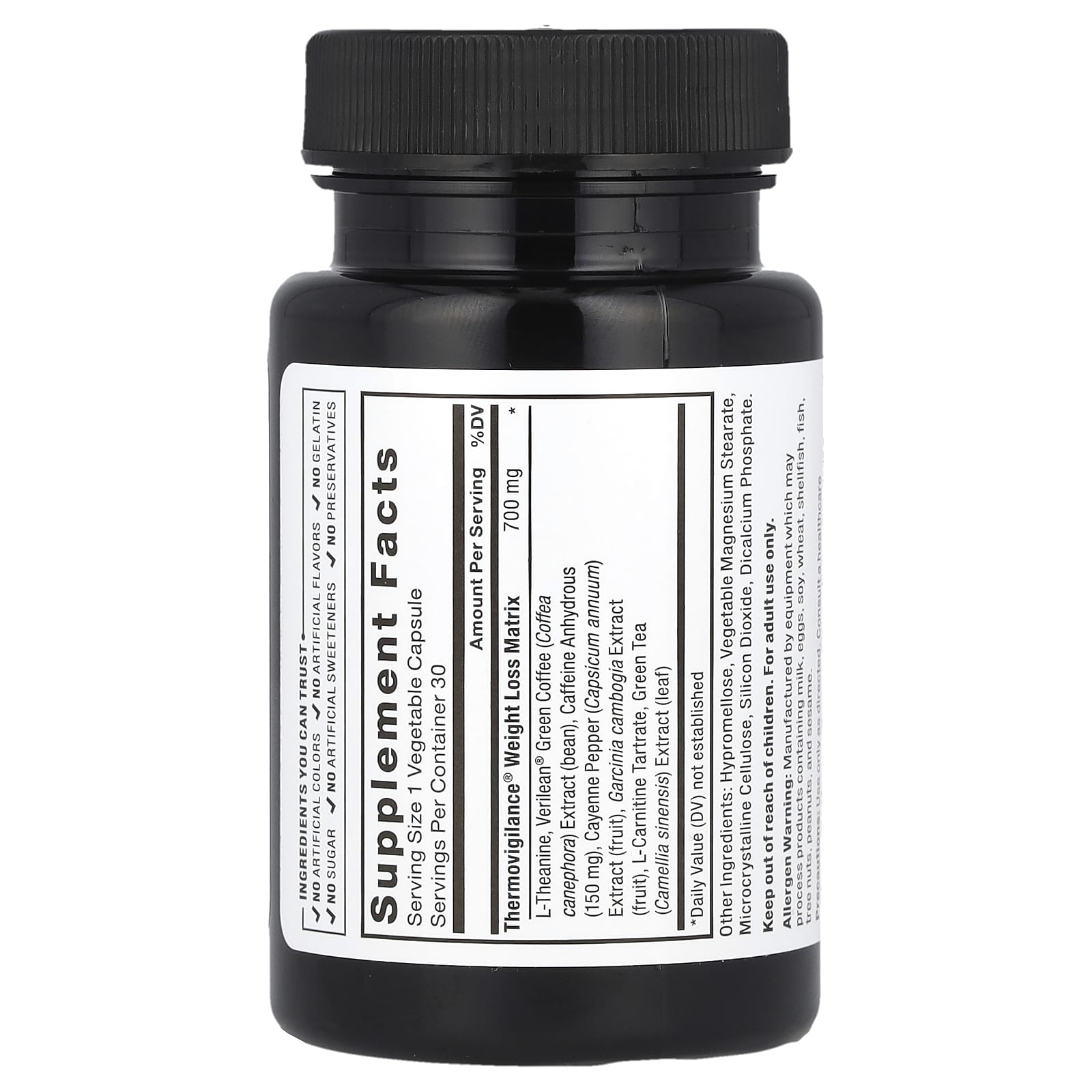 | Matriz de Perda de Peso Thermovigilance® L-Theanine, Extrato de Café Verde Verilean® (Coffea canephora) (grão), Cafeína Anidra (150 mg), Extrato de Pimenta Caiena (Capsicum annuum) (fruto), Extrato de Garcinia cambogia (fruta), L-carnitina, Extrato de Chá Verde (Camellia sinensis) (folha) |