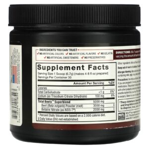 Precauções: use somente conforme indicado. Consulte um profissional de saúde antes de usar se estiver grávida ou amamentando, tiver algum problema de saúde ou usar medicamentos prescritos. Este produto contém nitratos e não deve ser usado em combinação com outros produtos que contenham nitratos, incluindo medicamentos para dor no peito ou disfunção erétil, como inibidores de PDE-5. Descontinue o uso duas semanas antes de qualquer cirurgia. Armazene em local fresco e seco. Proteja do calor, luz e umidade.