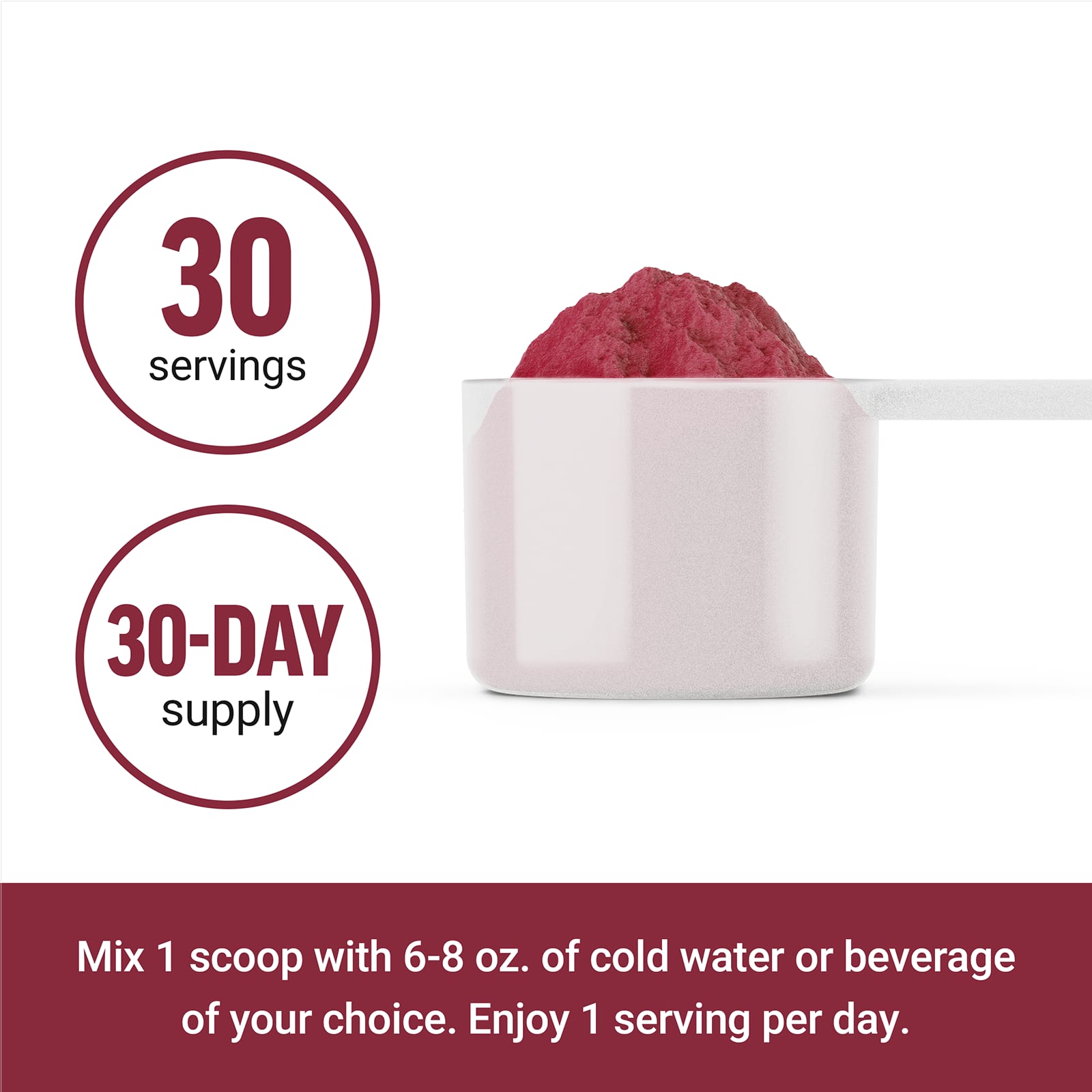 Misture 1 colher medidora com 8 a 10 oz de água gelada ou a bebida de sua escolha, variando a quantidade de líquido para atingir o sabor desejado. Consuma 1 porção diariamente.