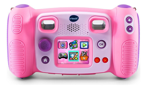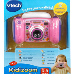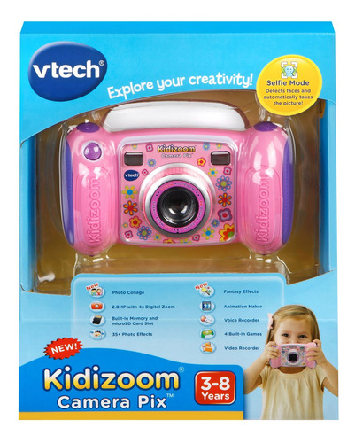VTech KidiZoom Camera Pix, Pink – Take real digital photographs with the durable Kidizoom Camera Pix by VTech; real 2.0 mega pixels camera with 4x digital zoom – The kid-friendly Kidizoom Camera Pix includes all the tools that budding photographers want in a digital camera; durable design protects from drops and tumbles – Selfie mode detects your face and automatically takes the perfect picture; four built-in games add to the fun; includes a video recorder and voice recorder for more creative ways to play – Fun photo collage templates in addition to static and animated photo effects enhance your pictures; more than 35 fun photo effects and 4 creative apps; connect to your computer to download all of your creations (Micro USB cable sold separately) – Built-in memory and micro memory card slot for memory expansion (micro memory card sold separately); requires 4 AA batteries (not included); intended for ages 3 to 8 years