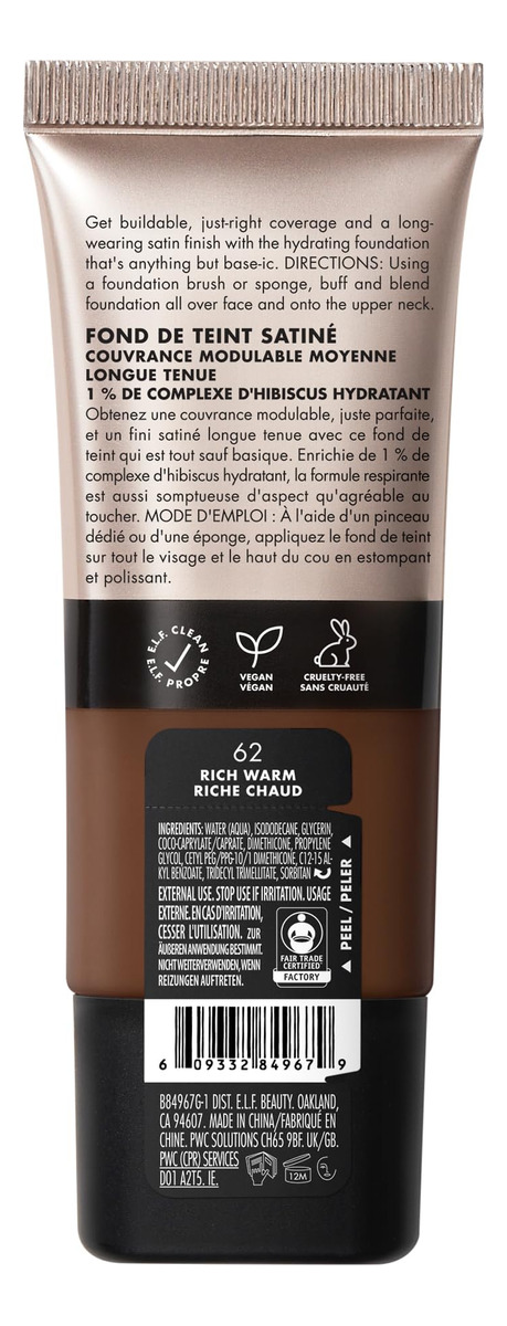 Base e.l.f. Soft Glam, cobertura média, base duradoura e montável para um acabamento suave e acetinado, vegana e livre de crueldade, 62 bases líquidas ricas e quentes de longa duração: alcance o ponto ideal dos sonhos entre a batida completa e quase inexistente com a base de cetim Soft Glam de longa duração da e.l.f. Cosmetics. – COBERTURA MÉDIA E EDIFICÁVEL: A base de acabamento acetinado e.l.f. Cosmetics oferece uma base líquida média e edificável cobertura e acabamento acetinado. — FÓRMULA RESPIRÁVEL: infundida com 1% de complexo hidratante de hibisco, além de extratos de frutas, essa base líquida respirável não obstrui os poros e É tão gostoso quanto parece. Aqui não fica endurecido ou pesado, apenas uma pele macia e acetinada. – Para vários tipos de pele: essa base é ótima para peles secas, oleosas e mistas. – INGREDIENTES QUE ADORAM A PELE: Todos os produtos da ELF são feitos com os ingredientes que você deseja, menos as toxinas que você não vende, a preços acessíveis. Todos os produtos da e.l.f. são 100% livres de crueldade e veganos.