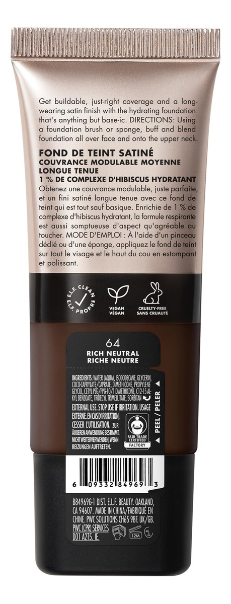 Base e.l.f. Soft Glam, cobertura média, base líquida duradoura e montável para um acabamento suave e acetinado, vegana e livre de crueldade, 64 ricos em neutralidade — BASE LÍQUIDA DE LONGA DURAÇÃO: alcance o ponto ideal dos sonhos entre a batida completa e quase inexistente com a base de cetim Soft Glam de longa duração da e.l.f. Cosmetics. – COBERTURA MÉDIA E EDIFICÁVEL: A base de acabamento acetinado e.l.f. Cosmetics oferece uma base de cetim Soft Glam de longa duração. cobertura e acabamento acetinado. — FÓRMULA RESPIRÁVEL: infundida com 1% de complexo hidratante de hibisco, além de extratos de frutas, essa base líquida respirável não obstrui os poros e É tão gostoso quanto parece. Aqui não fica endurecido ou pesado, apenas uma pele macia e acetinada. – Para vários tipos de pele: essa base é ótima para peles secas, oleosas e mistas. – INGREDIENTES QUE ADORAM A PELE: Todos os produtos da ELF são feitos com os ingredientes que você deseja, menos as toxinas que você não vende, a preços acessíveis. Todos os produtos da e.l.f. são 100% livres de crueldade e veganos.