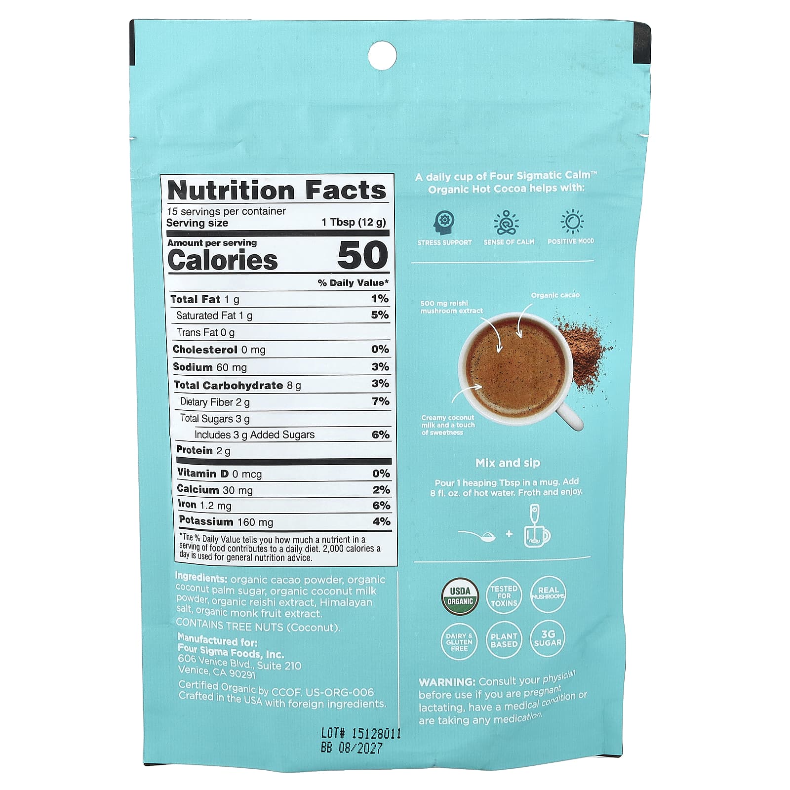 Cacau em pó orgânico, açúcar de palma de coco orgânico, leite de coco em pó orgânico, extrato de reishi orgânico, sal do Himalaia, extrato de luo han guo orgânico.