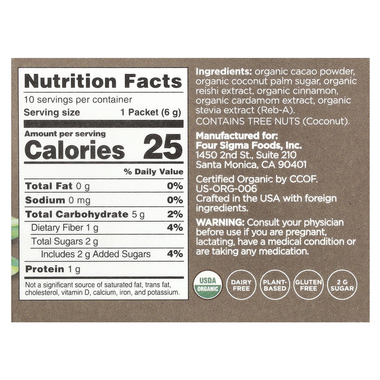 Cacau em pó orgânico, açúcar de palma de coco orgânico, extrato de reishi orgânico, canela orgânica, extrato de cardamomo orgânico, extrato de estévia orgânica (reb-A).
