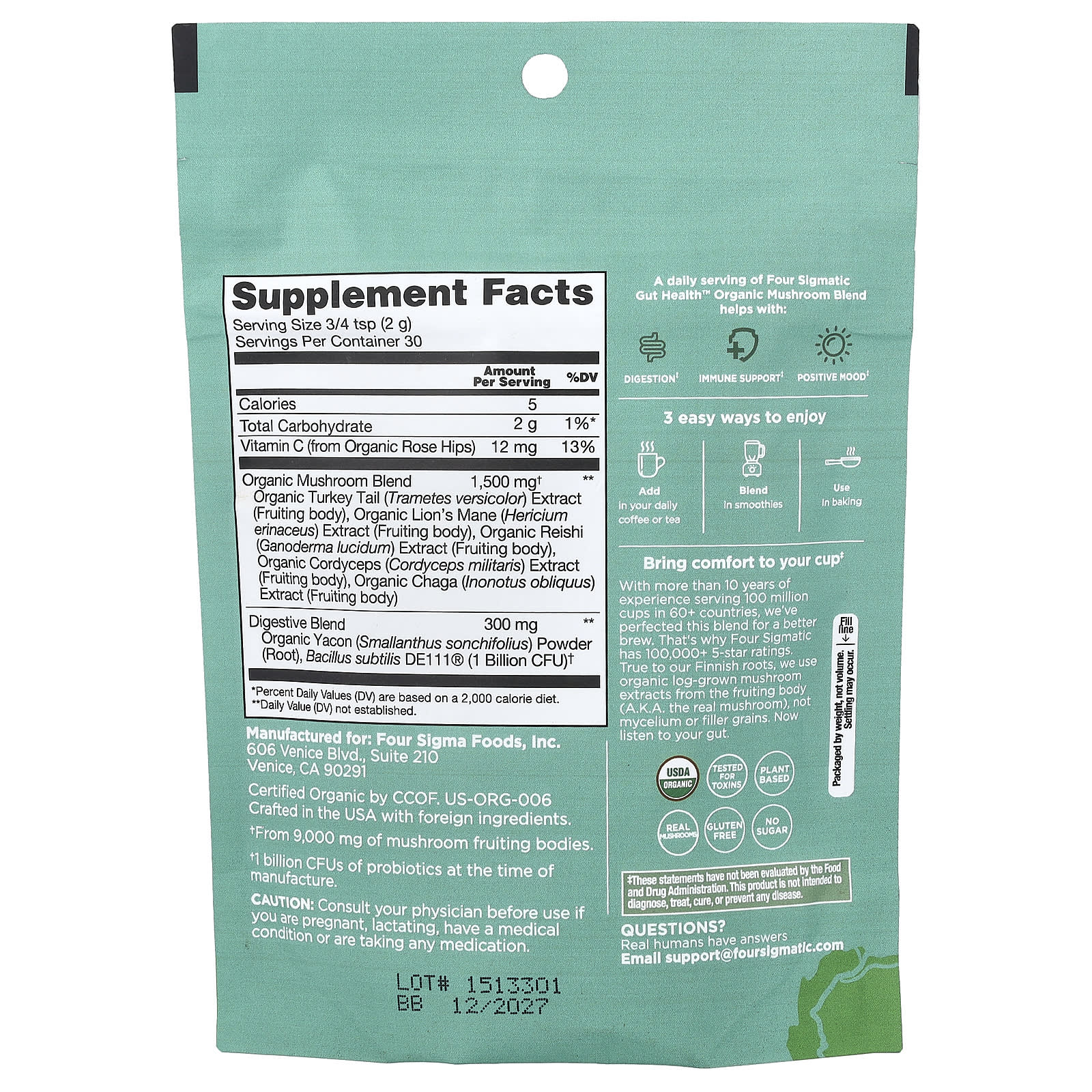 Four Sigmatic Saúde Intestinal Mistura de Cogumelos Orgânicos Sem Cafeína 60 g (212 oz) – Four Sigmatic Alimentos Chás e bebidas Tea Chás medicinais Coffee Café de Ervas e Cogumelos.