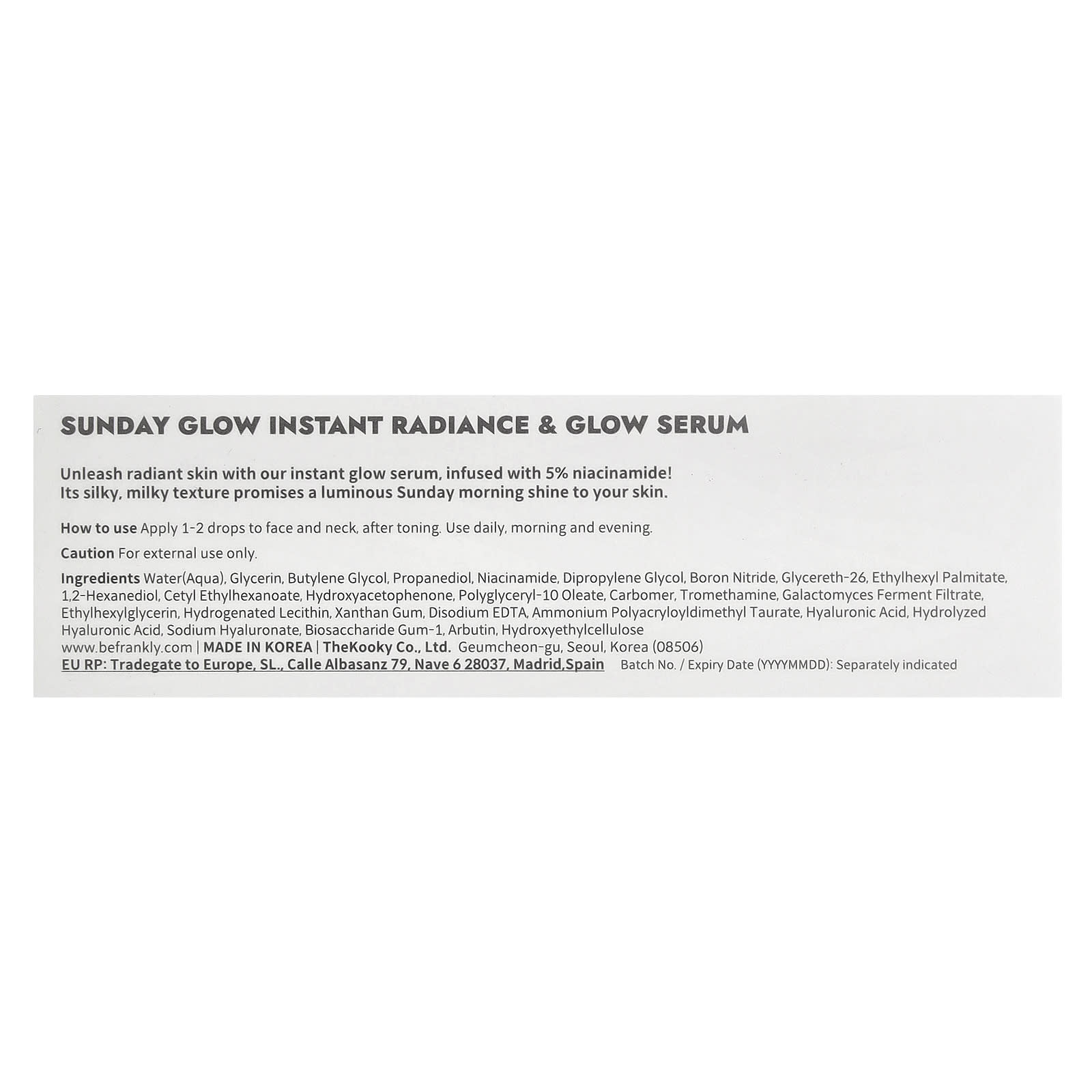 Água, glicerina, butilenoglicol, propanediol, nicotinamida, dimetildietilenoglicol, nitreto de boro, glycereth-26, ethylhexyl palmitate, 1,2-hexanediol, etilcaproato de cetila, hydroxyacetophenone, oleato de poliglicerila-10, carbômero, trometamol, filtrado de fermentação de Galactomyces, ethylhexylglycerin, lecitina hidrogenada, goma xantana, edetato dissódico, polyacryloyldimethyl taurate de amônio, ácido hialurônico, ácido hialurônico hidrolisado, hialuronato de sódio, goma de biossacarídeo-1, arbutin, hietelose.