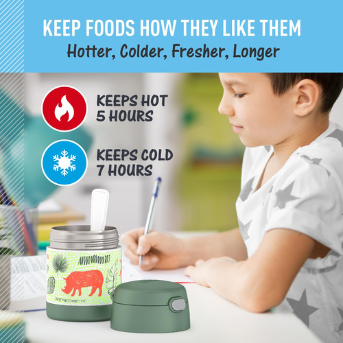 O frasco de alimentos FUNtainer de 10 onças da marca Thermos é isolado a vácuo para manter os alimentos quentes quentes e os frios frios – e, como foi projetado para crianças, também é colorido e divertido. Mande-os para a escola com sua sopa favorita para que possam saboreá-la fresca e quente na hora do almoço. Se eles estiverem com vontade de um lanche frio, embale-o com iogurte e frutas vermelhas ou maçãs e manteiga de amendoim. O pote de comida FunTainer é leve e compacto, com uma tampa de botão de pressão para que seja fácil de transportar e abrir. Para limpar, você pode colocar sua jarra de comida FUNtainer na máquina de lavar louça; no entanto, é recomendável lavar à mão. Colher incluída.