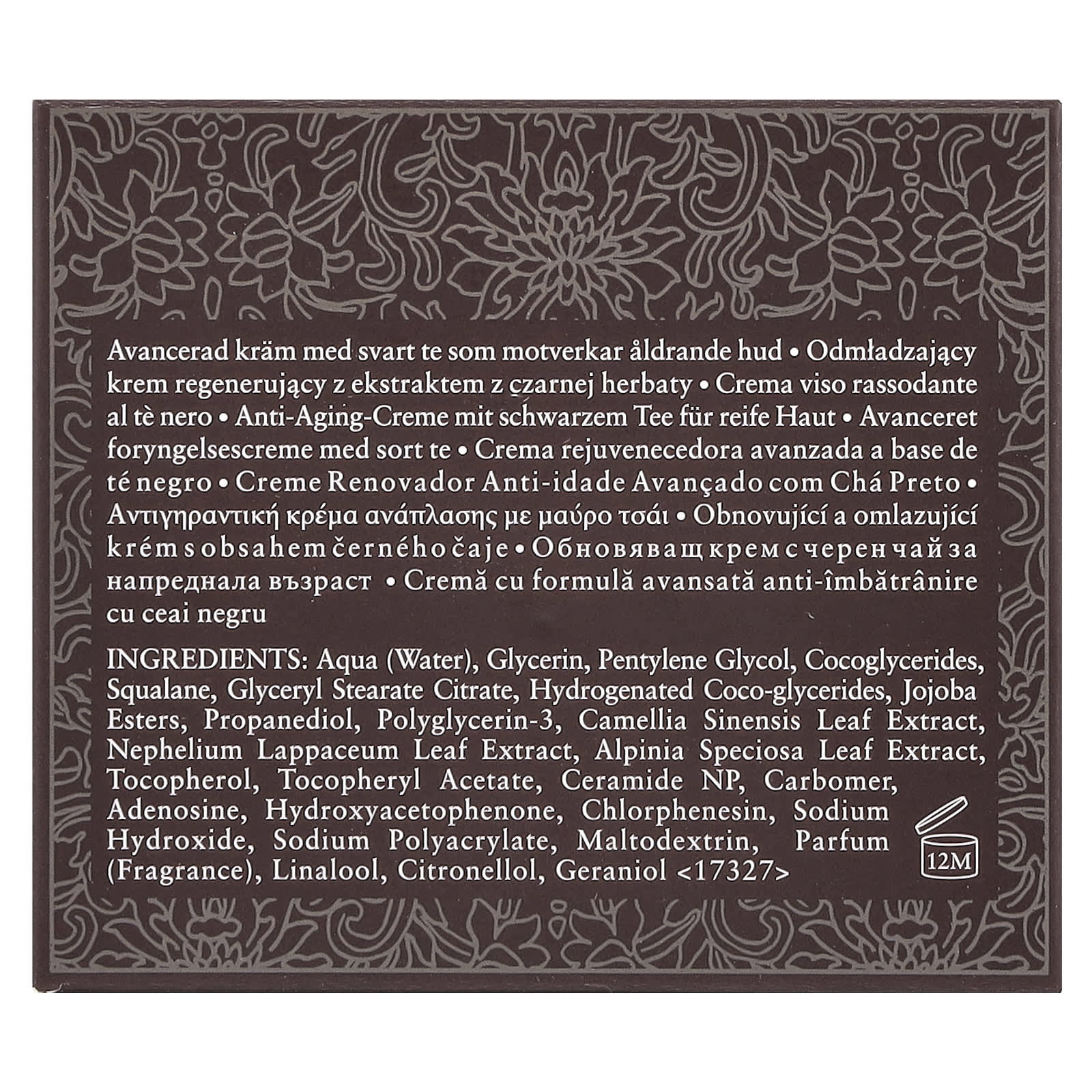 Aqua, glicerina, pentilenoglicol, glicerídeo de coco, esqualano, citrato de monoestearato de glicerila, glicerídeo de coco hidrogenado, jojoba esters, propanediol, polyglycerin-3, extrato da folha de Camellia sinensis, extrato da folha de Nephilium lappaceum, extrato da folha de Alpinia speciosa, tocoferol, acetato de tocoferol, ceramida NP, carbômero, adenosina, hydroxyacetophenone, clorfenesina, hidróxido de sódio, sodium polyacrylate, maltodextrina, perfume (fragrância), linalol, citronelol, geraniol.