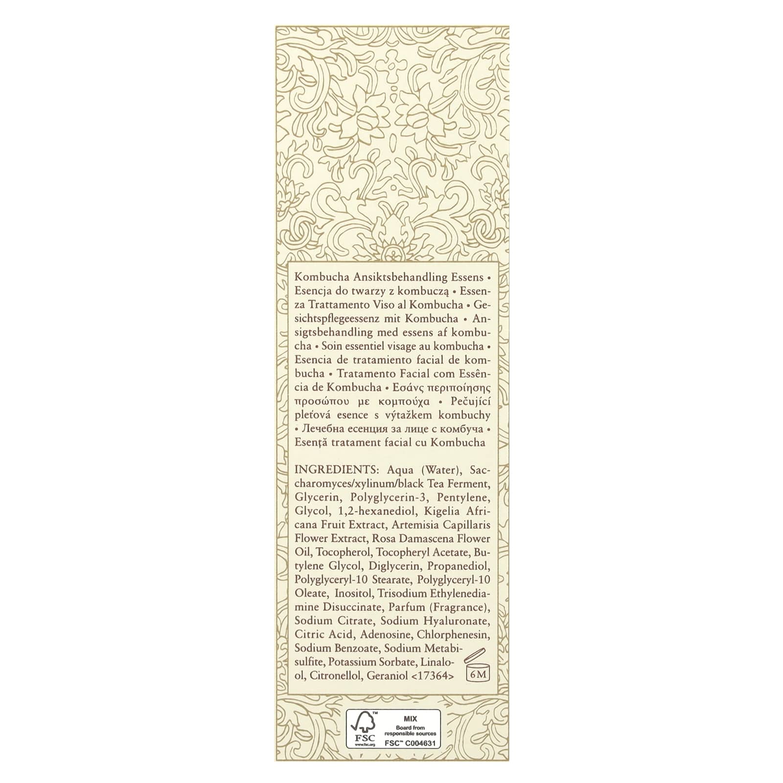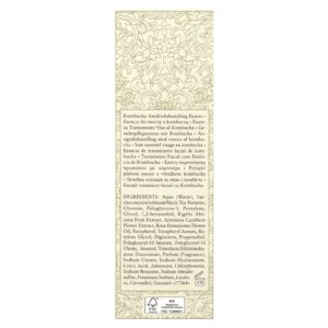 Água, Fermento de chá preto/Xylinum/Saccharomyces, glicerina, poliglicerina-3, pentileno, glicol, 1,2-hexanediol, extrato da fruta de Kigelia africana, extrato da flor de Artemisia capillaris, óleo da flor de Rosa damascena, tocoferol, acetato de tocoferol, butilenoglicol, diglicerina, propanodiol, estearato de poliglicerila-10, oleato de poliglicerila-10, inositol, disuccinato de etilenodiamina trissódica, perfume (fragrância), citrato de sódio, hialuronato de sódio, ácido cítrico, adenosina, clorfenesina, benzoato de sódio, metabissulfito de sódio, sorbato de potássio, linalol, citronelol, geraniol.