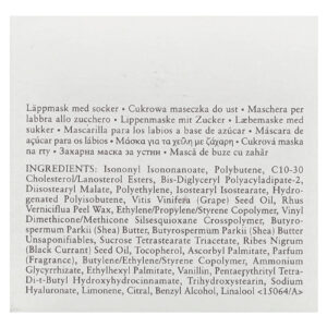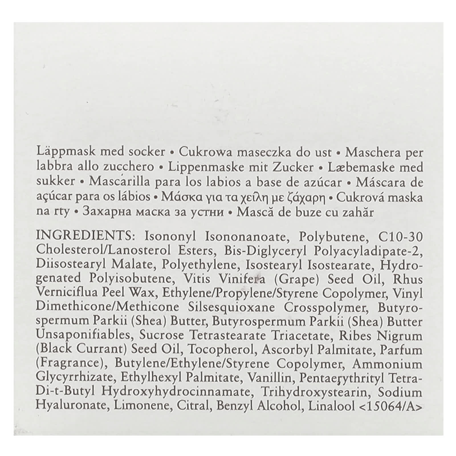 Isononil isononanoato, polibuteno, ésteres de lanosterol/colesterol c10-30, bis-diglicerila poliaciladipato-2, malato de diisoestearila, polietileno, isostearato de isostearílico, poli-isobutileno hidrogenado, óleo da semente de Vitis vinifera (uva), cera da casca de Rhus verniciflua, copolímero de etileno/propileno/estireno, vinyl dimethicone/methicone silsesquioxane crosspolymer, manteiga de Butyrospermum parkii (karité), insaponificáveis da manteiga de Butyrospermum parkii (karité), triacetato de tetraestearato de sacarose, óleo da semente de Ribes nigrum e groselha negra), tocoferol, palmitato de ascorbila, perfume (fragrância), copolímero de butileno/etileno/estireno, glicyrrhizate de amônio, palmitato de etilhexilo, vanilina, pentaeritril tetra-di-t-butyl hydroxyhydrocinnamate, trihidroxiestearina, hialuronato de sódio, limoneno, citral, álcool benzílico, linalol.