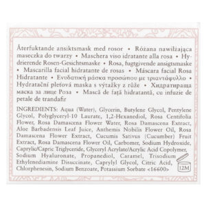 Água, glicerina, butilenoglicol, pentilenoglicol, laurato de poliglicerila-10, 1,2-hexanediol, flor de Rosa centifolia, água da flor de Rosa damascena, extrato de Rosa damascena, suco da folha de Aloe barbadensis, óleo da flor de Anthemis nobilis, extrato da flor de Rosa damascena, extrato do fruto de Cucumis sativus (pepino), óleo da flor de Rosa damascena, carbômer, hidróxido de sódio, triglicerídeo cáprico/caprílico, copolímero de ácido acrílico/acrilato de glicerila, hialuronato de sódio, propanodiol, caramelo, disuccinato de etilenodiamina trissódica, caprylyl glycol, ácido cítrico, clorfenesina, benzoato de sódio, sorbato de potássio .
