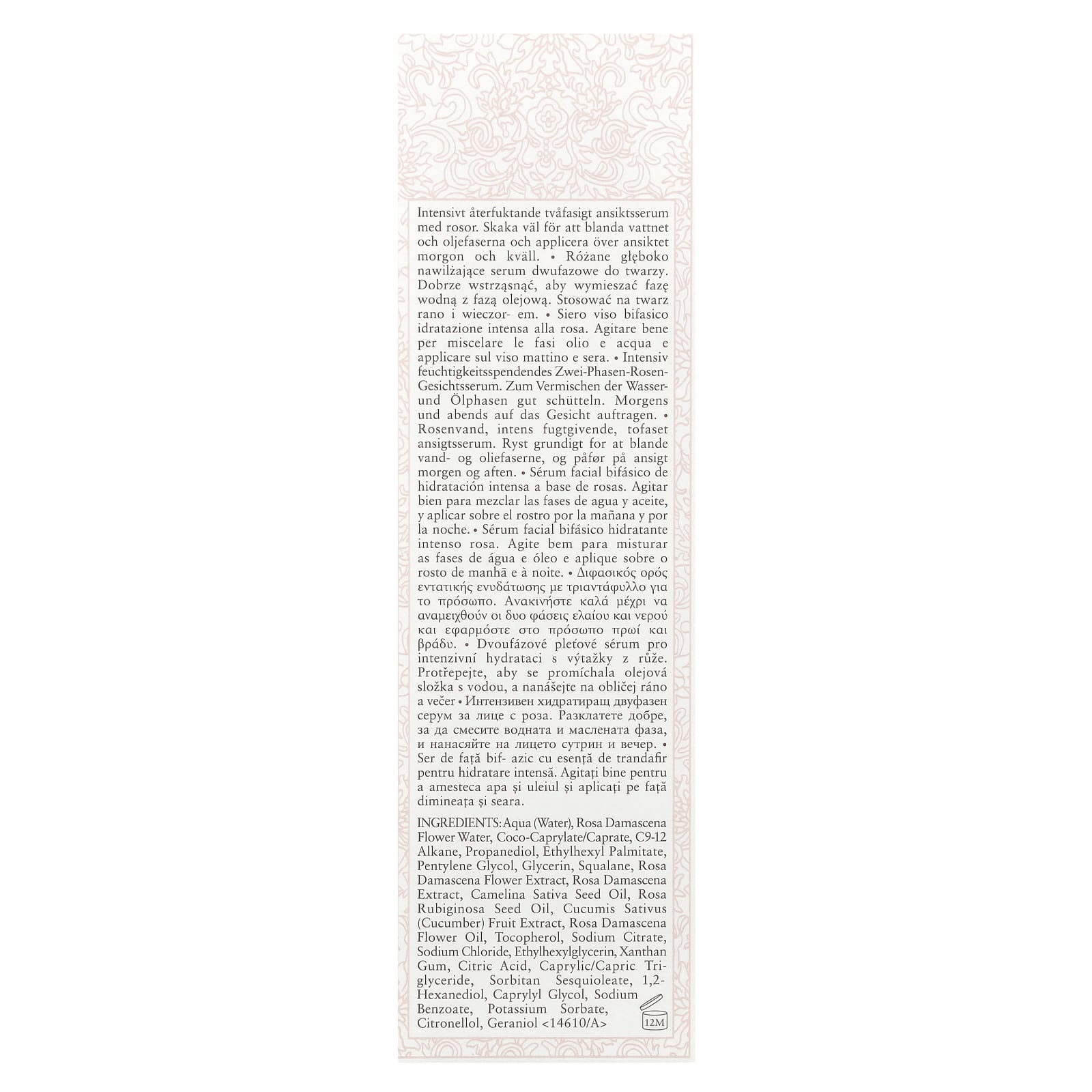 Água, água da flor de Rosa damascena, cococaprylate/caprate, alcano c9-12, propanodiol, palmitato de etilhexilo, pentilenoglicol, glicerina, esqualano, extrato da flor de Rosa damascena, extrato de Rosa damascena, óleo da semente de Camellia sativa, óleo da semente de Rosa rubiginosa, extrato do fruto de Cucumis sativus (pepino), óleo da flor de Rosa damascena, tocoferol, citrato de sódio, cloreto de sódio, ethylhexylglycerin, goma xantana, ácido cítrico, triglicerídeo cáprico/caprílico, sesquioleato de sorbitana, 1,2-hexanediol, caprylyl glycol, benzoato de sódio, sorbato de potássio, citronelol, geraniol.