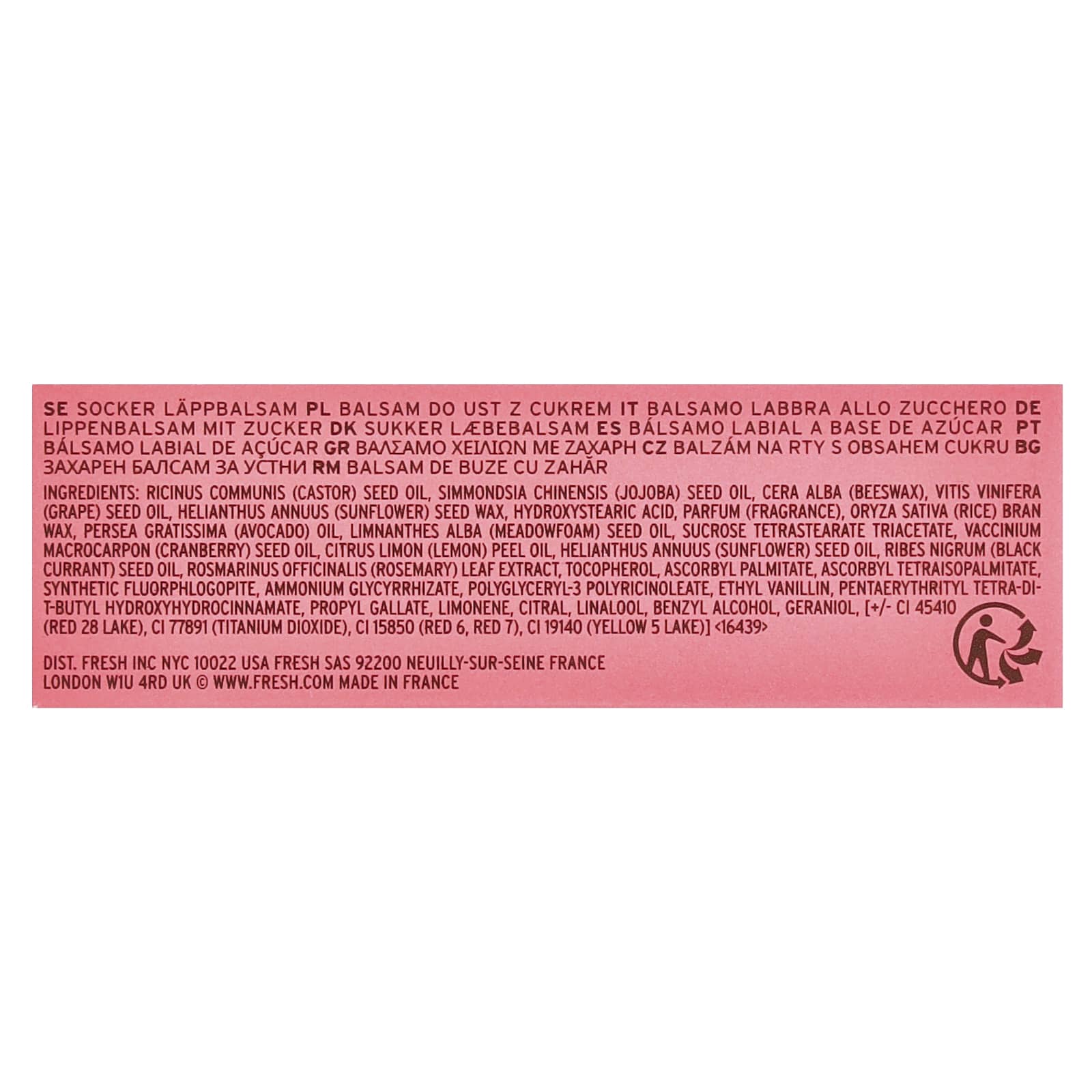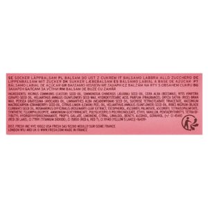 Óleo da semente de Ricinus communis (rícino), óleo da semente de Simmondsia chinensis (jojoba), cera alba (cera de abelha), óleo da semente de Vitis vinifera (uva), cera da semente de Helianthus annuus (girassol), ácido hidroxiesteárico, perfume (fragrância), cera do farelo de Oryza sativa (arroz), óleo de Persea gratissima (abacate), óleo da semente de Limnanthes alba (meadowfoam), triacetato de tetraestearato de sacarose, óleo da semente de Vaccinium macrocarpon (cranberry), óleo da casca de Citrus limon (limão), óleo da semente de Helianthus annuus (girassol), óleo da semente de Ribes nigrum (groselha negra), extrato da folha de Rosmarinus officinalis (alecrim), tocoferol, palmitato de ascorbila, tetraisopalmitato de ascorbila, fluoroflogopita sintética, glicyrrhizate de amônio, poliricinoleato de poliglicerila-3, etilvanilina, pentaeritritol tetra-di-t-butil hidroxihidrocinano, galato de propileno, limoneno, citral, linalol, álcool benzílico, o geraniol, [+/- CI 45410 (vermelho 28 laca de alumínio), CI 77891 (dióxido de titânio), CI 15850 (vermelho 6, vermelho 7), CI 19140 (amarelo 5 laca de alumínio)].