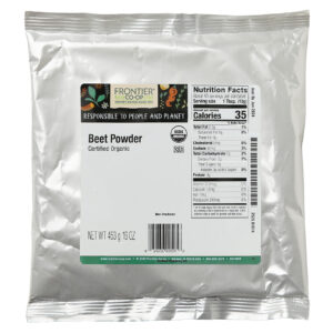 A Beterraba Orgânica a Granel da Frontier Co-op é popular como reforço para smoothies e outros alimentos, e também é usada para adicionar sua cor vermelha natural aos alimentos. É feito da raiz carnuda e vermelha da beterraba. Um quilo de beterraba em pó é aproximadamente equivalente a dez quilos de beterraba fresca.