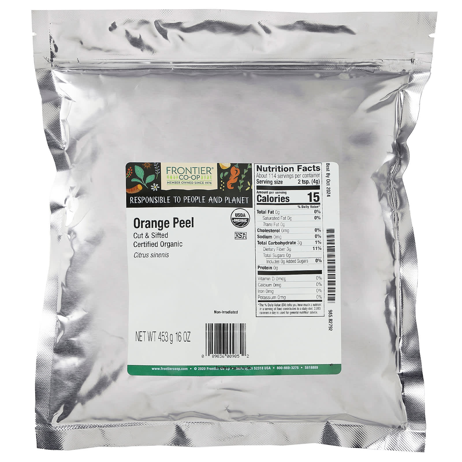 Frontier Co-op Casca Orgânica de Laranja Cortada & Peneirada 16 oz (453 g) – Frontier Co-op Alimentos Ervas e temperos.