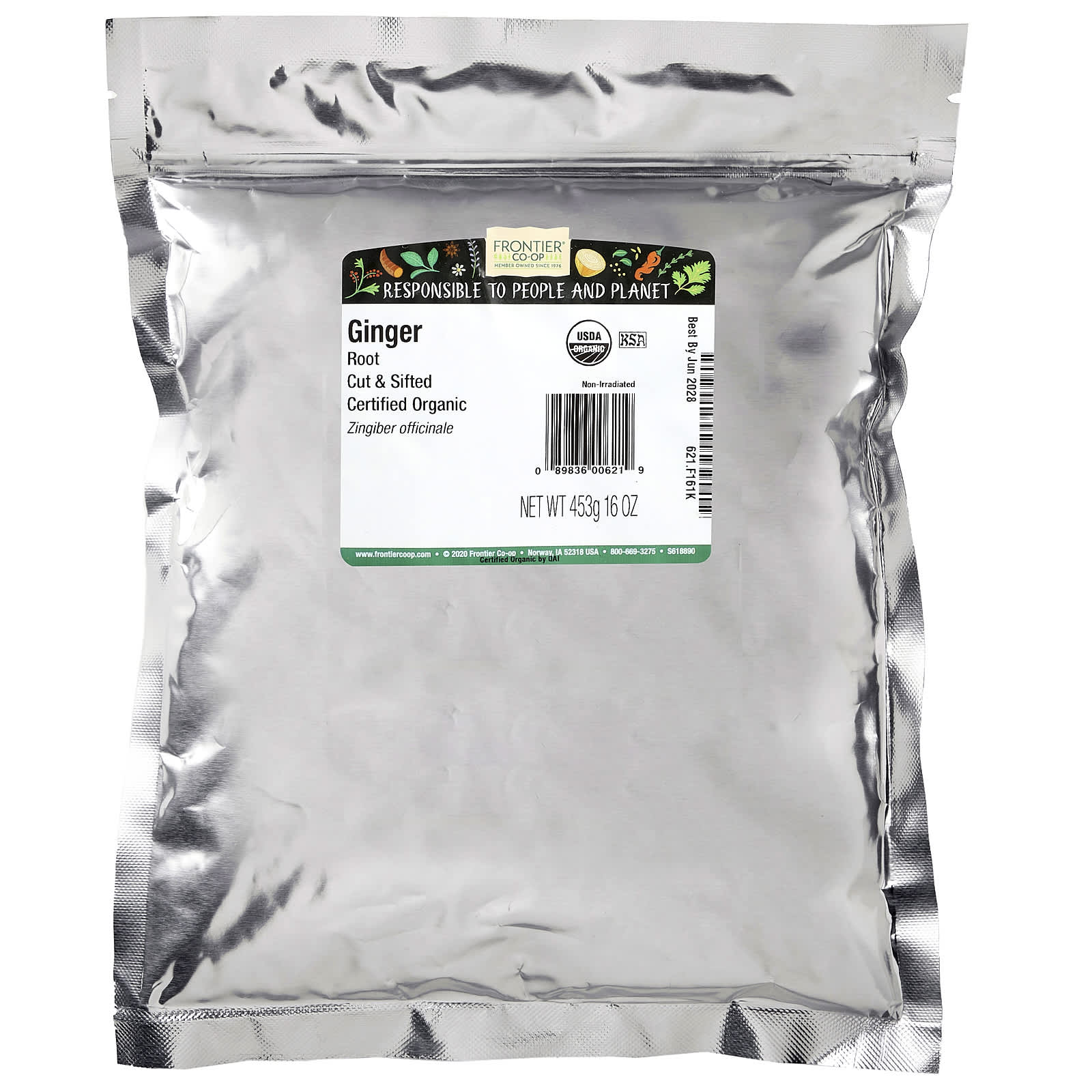 Frontier Co-op Raiz de Gengibre Orgânico Cortado e Peneirado 453 g (16 oz) – Frontier Co-op Alimentos Ervas e temperos Pó de gengibre Petiscos e lanches Frutas e Legumes Secos.