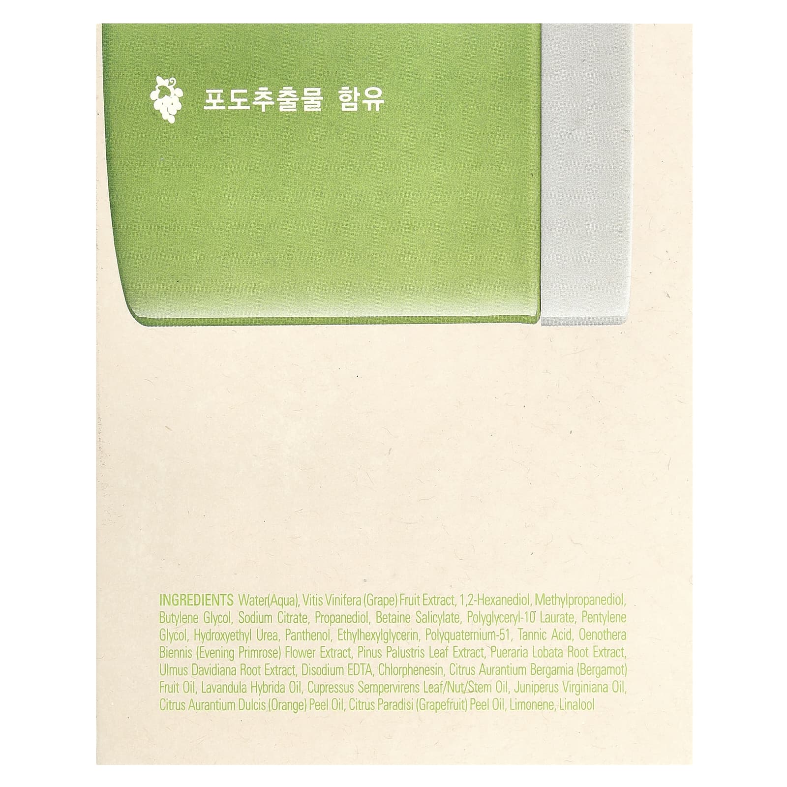 Água, extrato da fruta de Vitis vinifera (uva), 1,2-hexanediol, metilpropanodiol, butilenoglicol, citrato de sódio, propanediol, salicilato de betaína, polyglyceryl-10 laurate, pentilenoglicol, hydroxyethyl urea, pantenol, ethylhexylglycerin, poliquatérnio-51, ácido tânico, extrato da flor de Oenothera biennis (prímula), extrato da folha de Pinus palustris, extrato da raiz de Pueraria lobata, extrato da raiz de Ulmus davidiana, edetato dissódico, clorfenesina, óleo da fruta de Citrus aurantium bergamia (bergamota), óleo de Lavandula hybrida, óleo da folha/noz/caule de Cupressus sempervirens, óleo de Juniperus virginiana, óleo da casca de Citrus aurantium dulcis (laranja), óleo da casca de Citrus paradisi (toranja rosa), limoneno, linalool.