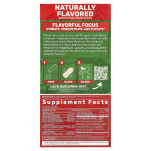 | Mistura de Hidratação e Foco Mistura de Eletrólitos (Citrato de Potássio 1.705 mg, Citrato de Sódio 535 mg, Fosfato de Cálcio Dibásico 445 mg, Citrato de Magnésio 300 mg, Sal Rosa do Himalaia 150 mg, Aquamin™ Citrato de Cálcio Derivado de Algas Marinhas Aquamin™ 150 mg), Extrato de Cogumelo Juba-de-Leão Orgânico (Hericium erinaceus) (Frutificação Corpo) 1.000 mg, L-Tirosina 1.000 mg, Hemitartarato de Colina 350 mg, L-Theanine 150 mg. |