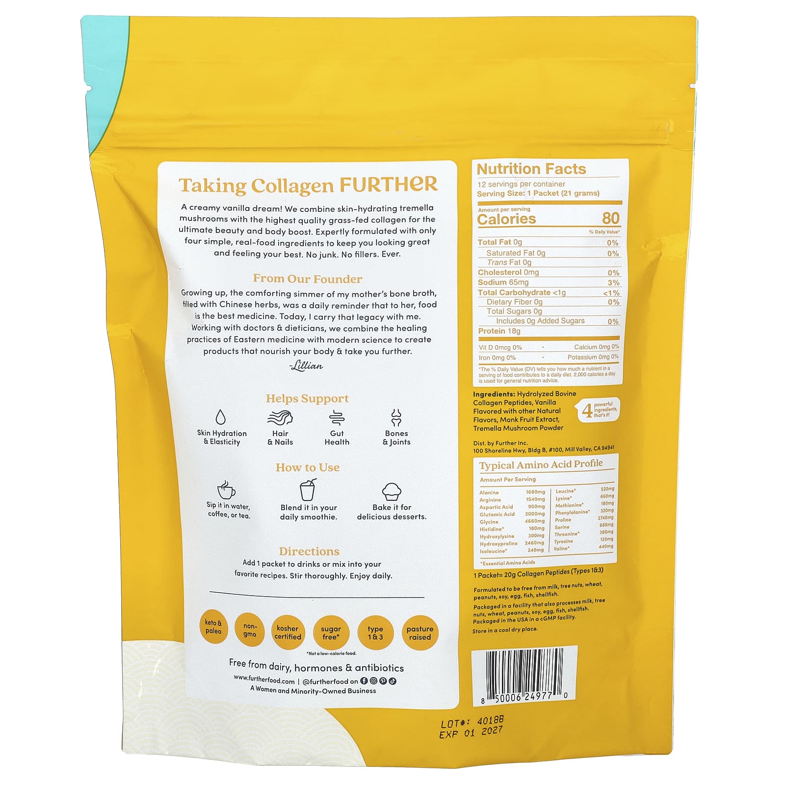 Further Food Peptídeos de Colágeno de Gado Criado no Pasto Baunilha 12 Embalagens 21 g (074 oz) Cada – Further Food Suplementos Ossos, Articulações e Cartilagem Colágeno, Suplementos.