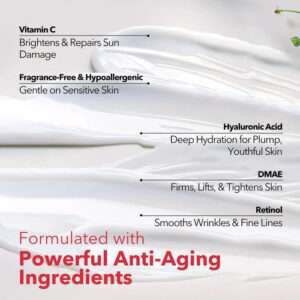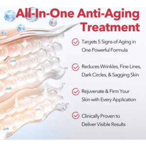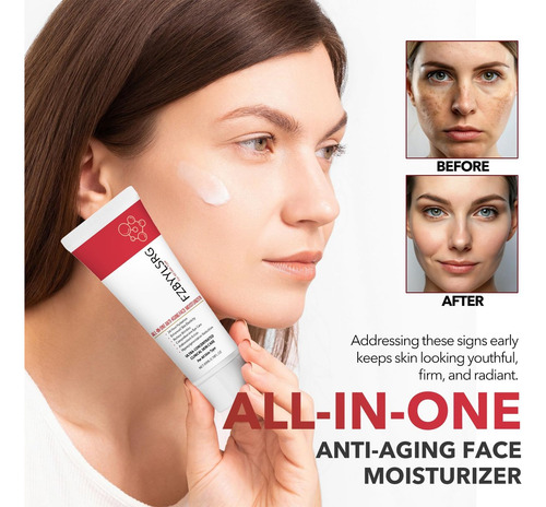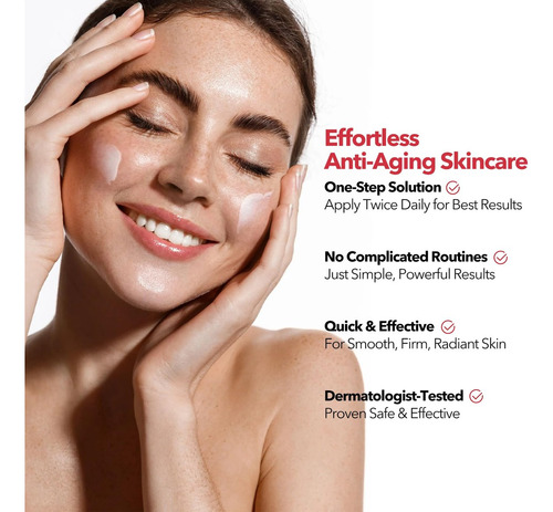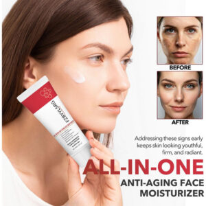 tratamento antienvelhecimento tudo-em-um de 2,7 oz formulado com ingredientes naturais e tecnologia avançada que combina peptídeos e antioxidantes poderosos para reduzir a aparência de linhas finas e rugas, melhorar a elasticidade da pele e obter uma tez mais jovem e radiante. Este creme promove a regeneração e reparo celular, combate os sinais de envelhecimento, como rugas e flacidez, absorve os raios UV e protege a pele contra danos ambientais. Sua fórmula suave é adequada para todos os tipos de pele, incluindo peles sensíveis, e não obstrui os poros, deixando a pele macia, flexível e não oleosa. Fácil de aplicar, recomenda-se usar de manhã e à noite após a limpeza, massageando suavemente para promover a absorção.
