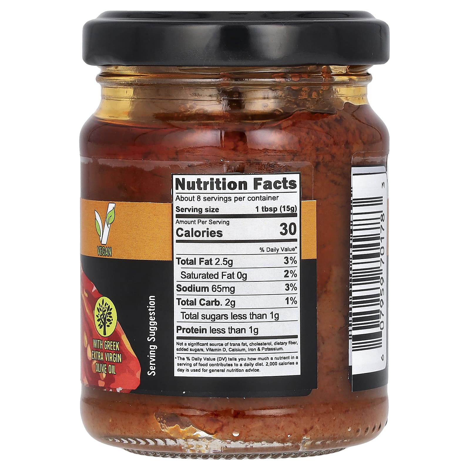 Água, azeitonas kalamata, tomate seco, óleo de oliva extravirgem, vinagre, suco de maçã concentrado, sal, cebola em pó, orégano, mostarda em pó.