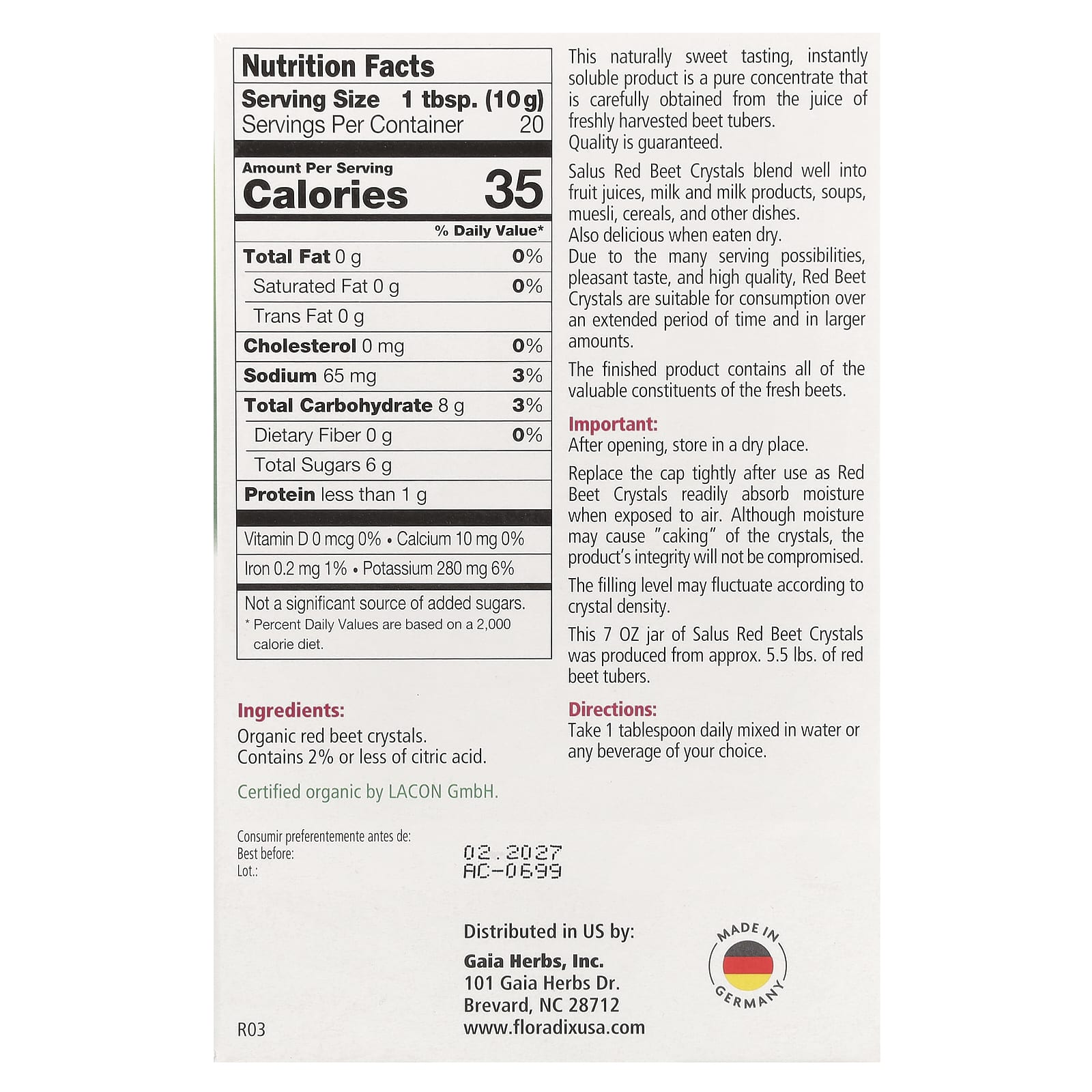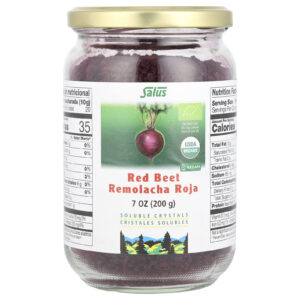 Este 7 oz. pote de Cristais de Beterraba Salus foi produzido a partir de aprox. 5,5 lbs de tubérculos de beterraba vermelha.