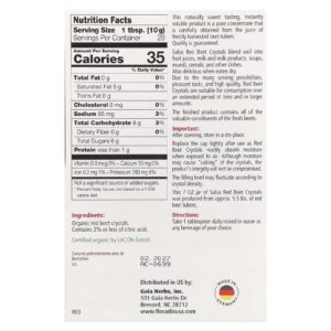 Os Cristais de Beterraba Vermelha da Salus misturam-se bem com sucos de frutas, leite e laticínios, sopas, muesli, cereais e outros pratos. Também é delicioso quando comido seco.