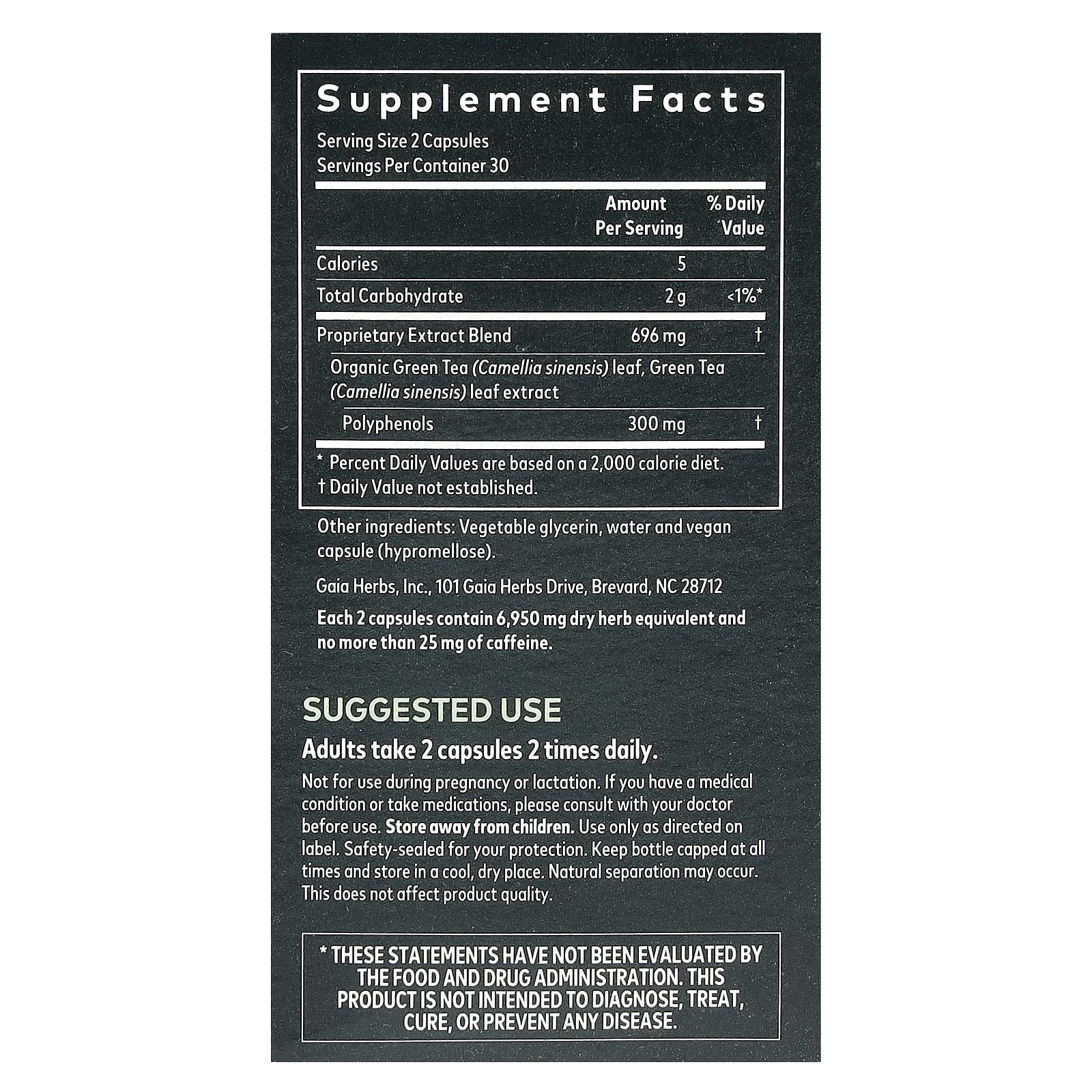 Cada 2 cápsulas contêm 6,950 mg de equivalente a erva seca e no máximo 15 mg de cafeína.