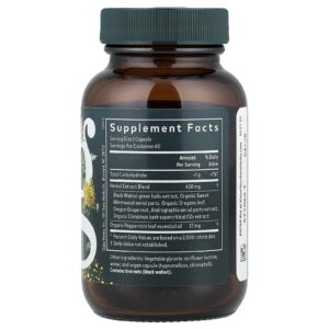 Extrato da casca verde de Nogueira-preta, partes aéreas de Absinto Doce Orgânico, Folha de Orégano Orgânico, Raiz de Uva do Oregon, extrato das partes aéreas de Andrographis, extrato de CO2 supercrítico da casca de Canela Orgânica.