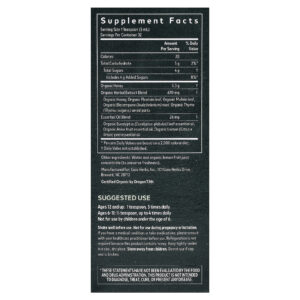 | Mistura de Extrato de Ervas Orgânicas Mel Orgânico, Folha de Plátano Orgânico, Folha de Verbasco Orgânico, Raiz de Erva-campeira Orgânica (Inula helenium), Tomilho Orgânico (Thymus vulgaris) partes aéreas |