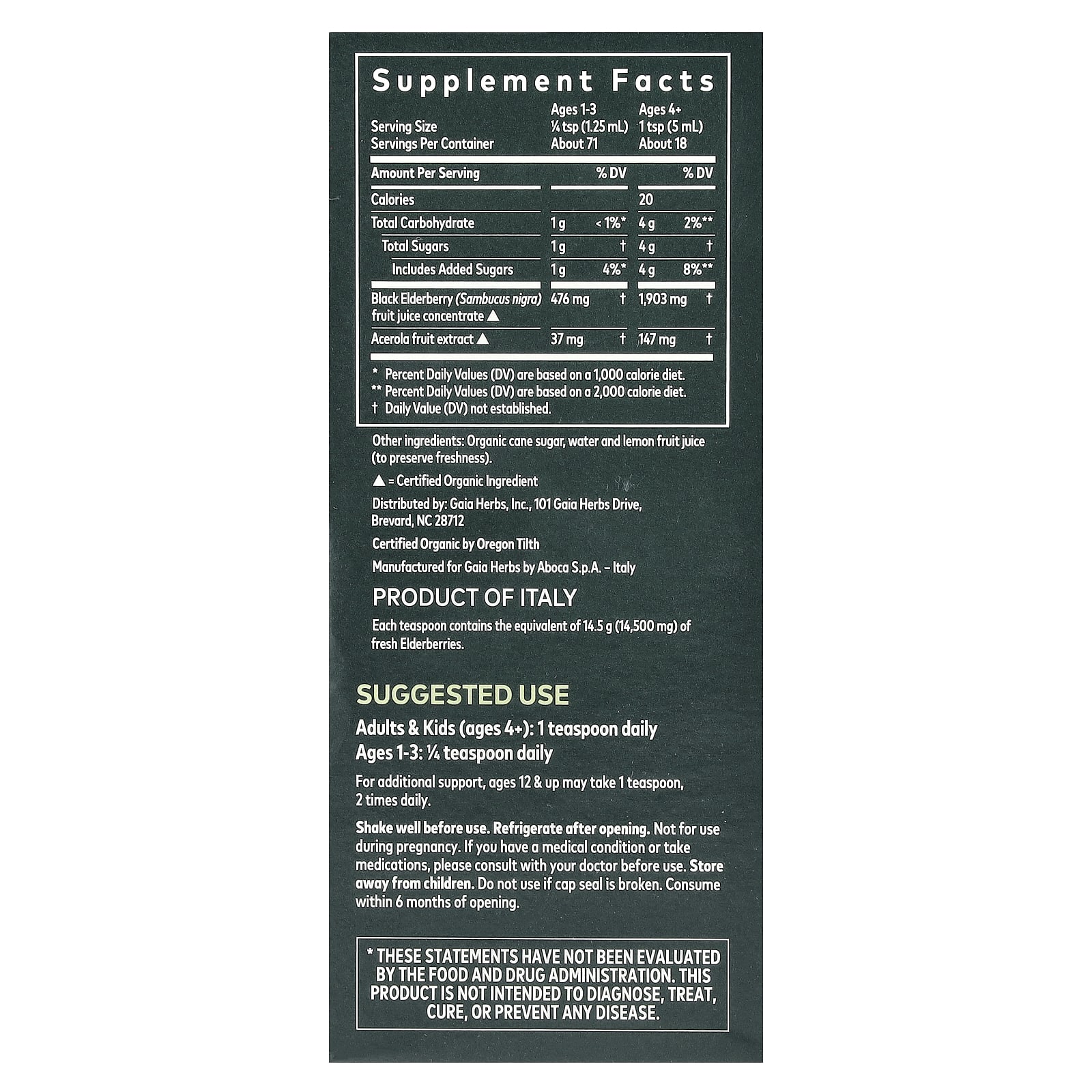 O Xarope de Sabugueiro Preto é produzido na Toscana, Itália, pela Aboca, o suplemento de ervas líder na Europa desde 1978. A parceria da Gaia Herbs com a Aboca nasceu de uma crença mútua no desenvolvimento de produtos sustentáveis, dedicação à qualidade e um profundo respeito pela ciência e pela natureza trabalhando em harmonia.