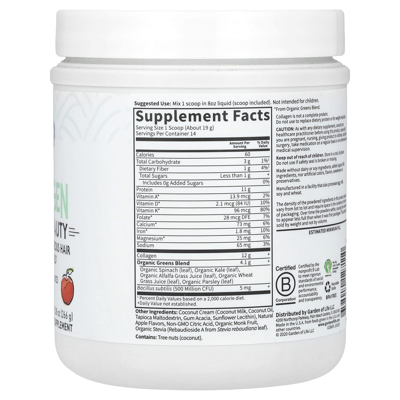Garden of Life Colágeno de Gado Criado no Pasto Greens Beauty Maçã 266 g (938 oz) – Garden of Life Suplementos Ossos, Articulações e Cartilagem Colágeno, Suplementos.