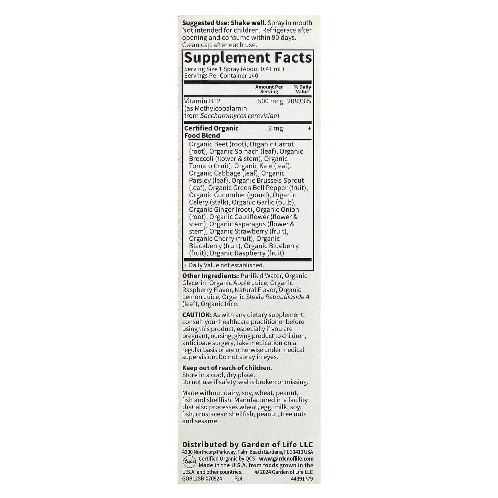 Garden of Life MyKind Organics B-12 Spray Orgânico Framboesa 58 ml (2 fl oz)