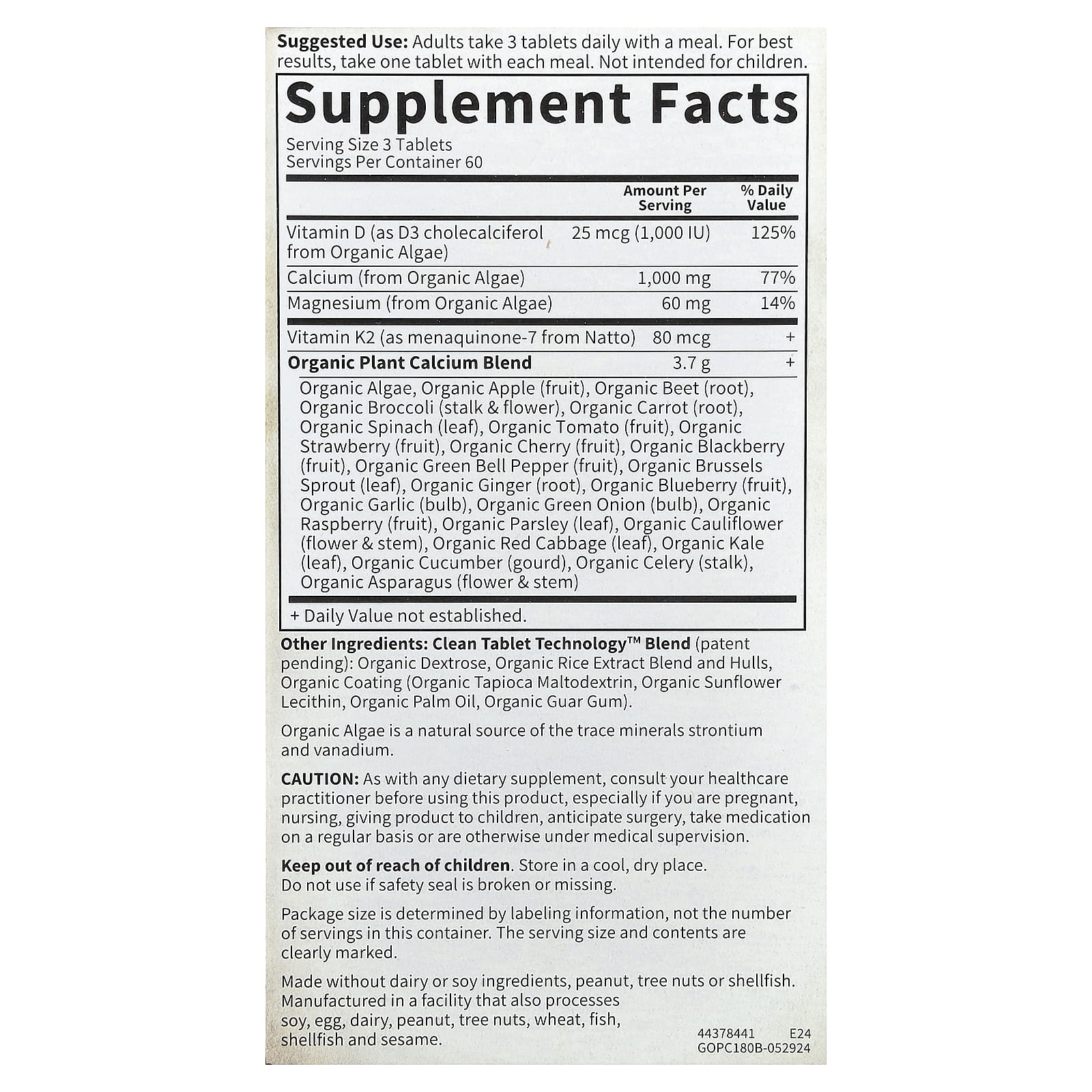 Cálcio de Origem Vegetal mais Vitaminas D3 e K2 como MK-7 com mais de 20 Alimentos Orgânicos de Cultivo Familiar
