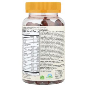 Mistura básica de gomas mastigáveis de frutas orgânicas certificadas: Maçã orgânica (fruta, concentrado do purê e concentrado do suco), pêssego orgânico (concentrado do purê da fruta), fibra de tapioca orgânica, pectina (de maçãs e laranjas), sabor de pêssego orgânico, concentrado de suco de cenoura roxa orgânica (para dar cor), laranja orgânica (casca), farinha de arroz orgânico e óleo de girassol orgânico (para o revestimento), mistura de vitaminas de alimentos naturais com certificado orgânico: emblic orgânico (amla, Phyllanthus emblica) (fruta), Sesbania grandiflora orgânica (folha), Psidium guajava orgânica (fruto e folha de goiaba), limão orgânico (casca), Ocimum sanctum orgânico (folha de manjericão santo), urucum orgânico (fruto e semente), Moringa oleifera orgânica (folha de moringa), beterraba orgânica (raiz), brócolis orgânico (talo e floretes), cenoura orgânica (raiz), espinafre orgânico (folha), tomate orgânico (fruto), morango orgânico (fruto), cereja orgânica (fruta), amora orgânica (fruto), pimentão verde orgânico (fruto), couve-de-bruxelas orgânica (folha), gengibre orgânico (raiz), mirtilo orgânico (fruto), alho orgânico (bulbo), cebolinha verde orgânica (bulbo), framboesa orgânica (fruto), salsinha orgânica (folha), couve-flor orgânica (talo e floretes), repolho roxo orgânico (folha), aspargos orgânicos (talo e floretes), aipo orgânico (talo), pepino orgânico (cabaça), couve orgânica (folha).