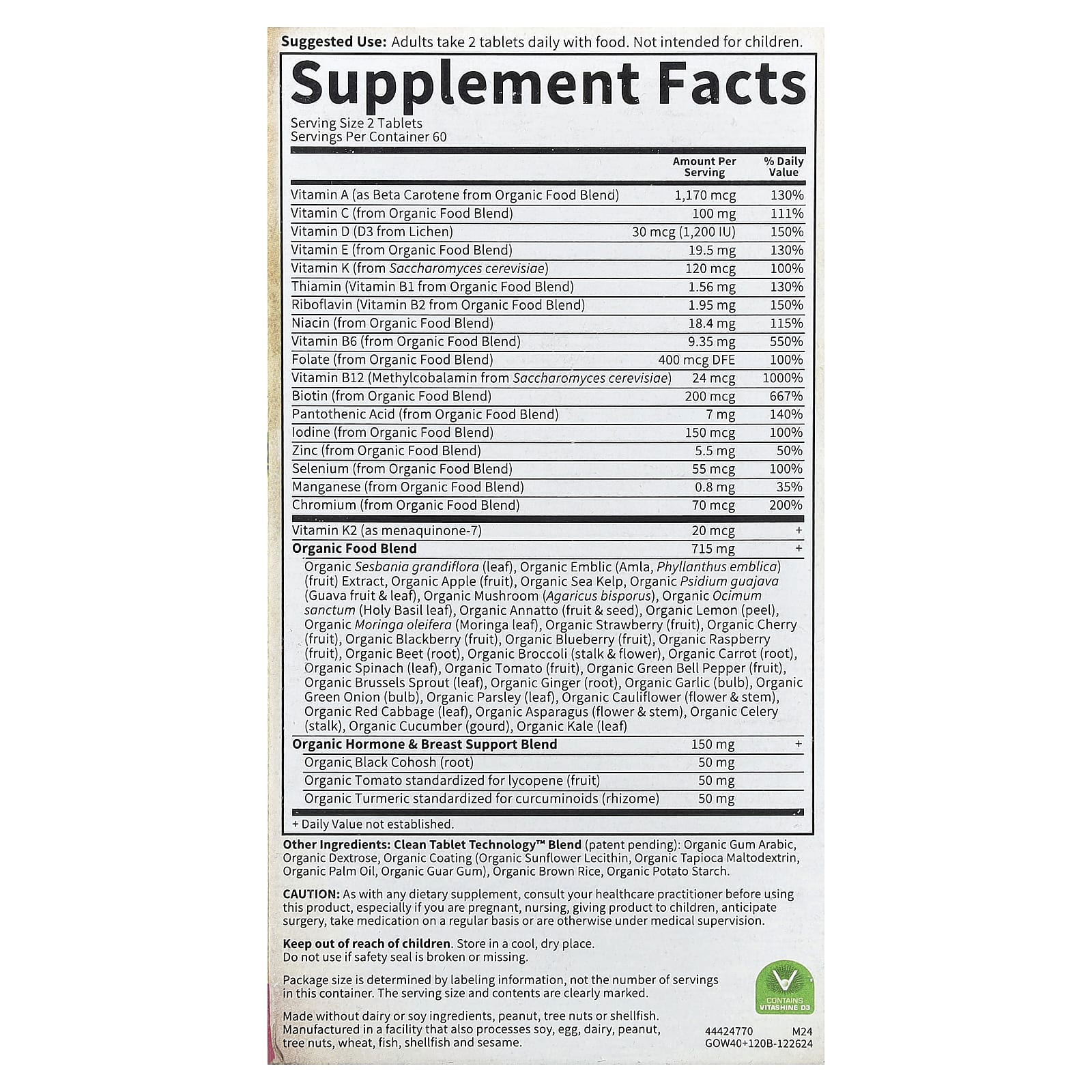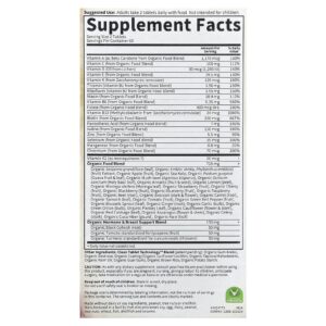 Multivitamínico Integral orgânico certificado, verificado como Não OGM e feito com alimentos reais e nutritivos.