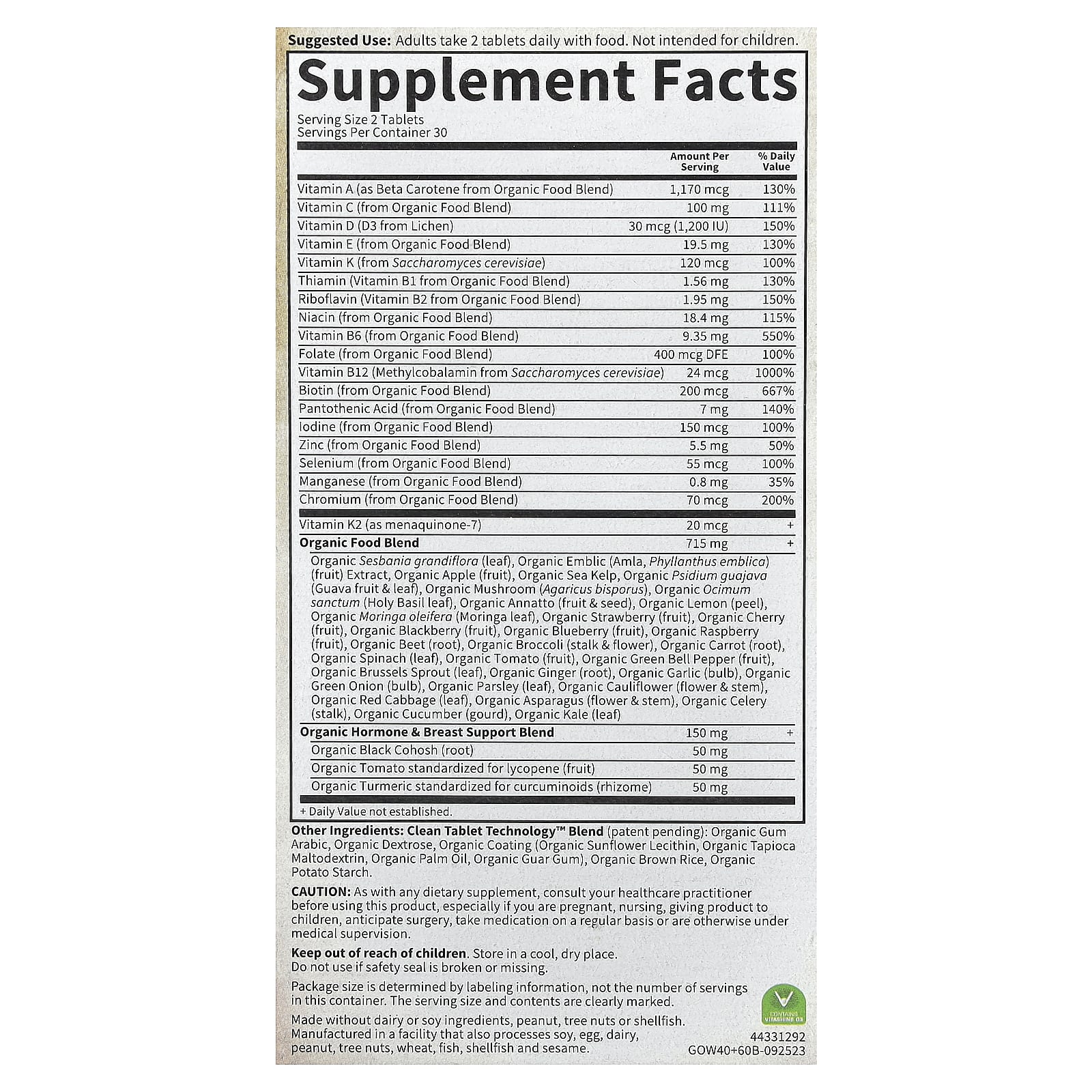 Multivitamínico Integral orgânico certificado, verificado como Não OGM e feito com alimentos reais e nutritivos.