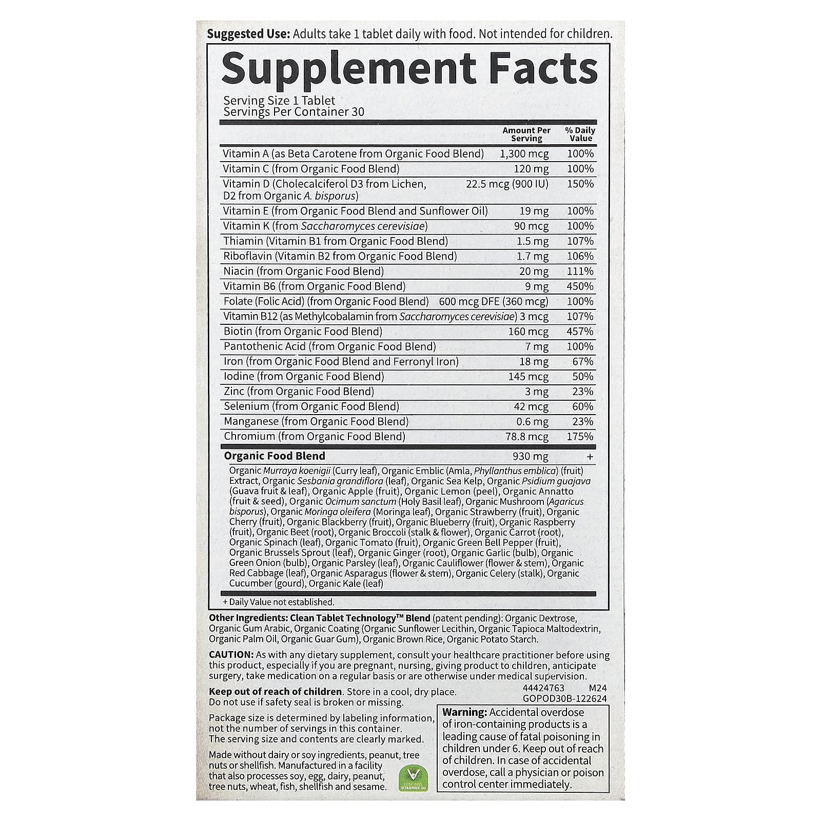 Multivitamínico Integral que é certificado orgânico, verificado como não OGM e feito com alimentos reais, honestos e nutritivos