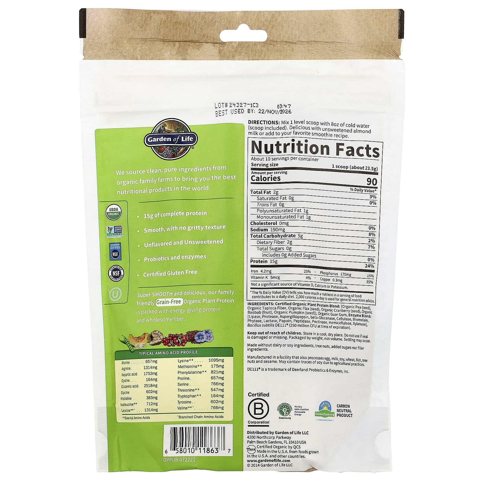 Garden of Life Proteína à Base de Plantas Orgânicas Sem Grãos Sem Sabor e Suave 236 g (83 oz) – Garden of Life Nutrição Esportiva Proteína Proteína Vegetal Mistura Proteica à Base de Plantas.