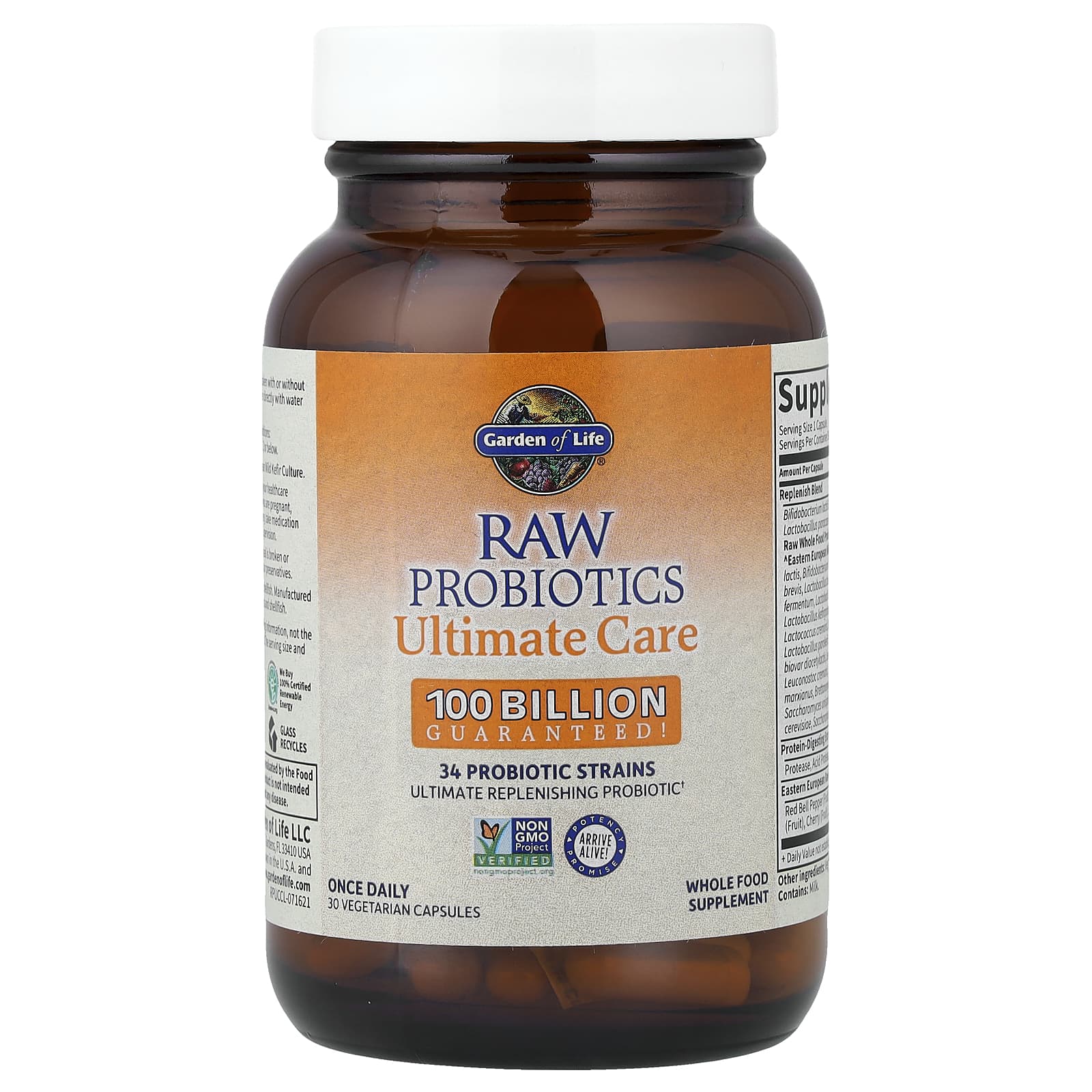 100 Bilhões de UFCs, normalmente contendo 34 Probióticos com Espécies clinicamente estudadas, além da Cultura de Kefir Selvagem da Europa Oriental.