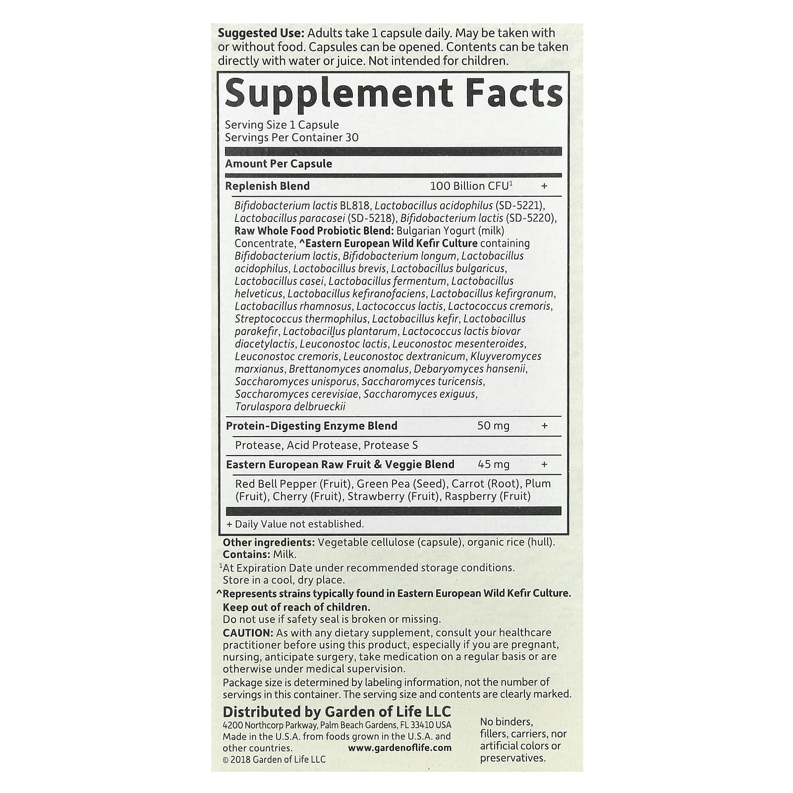 100 Bilhões de UFCs, normalmente contendo 34 Probióticos com Espécies clinicamente estudadas, além da Cultura de Kefir Selvagem da Europa Oriental