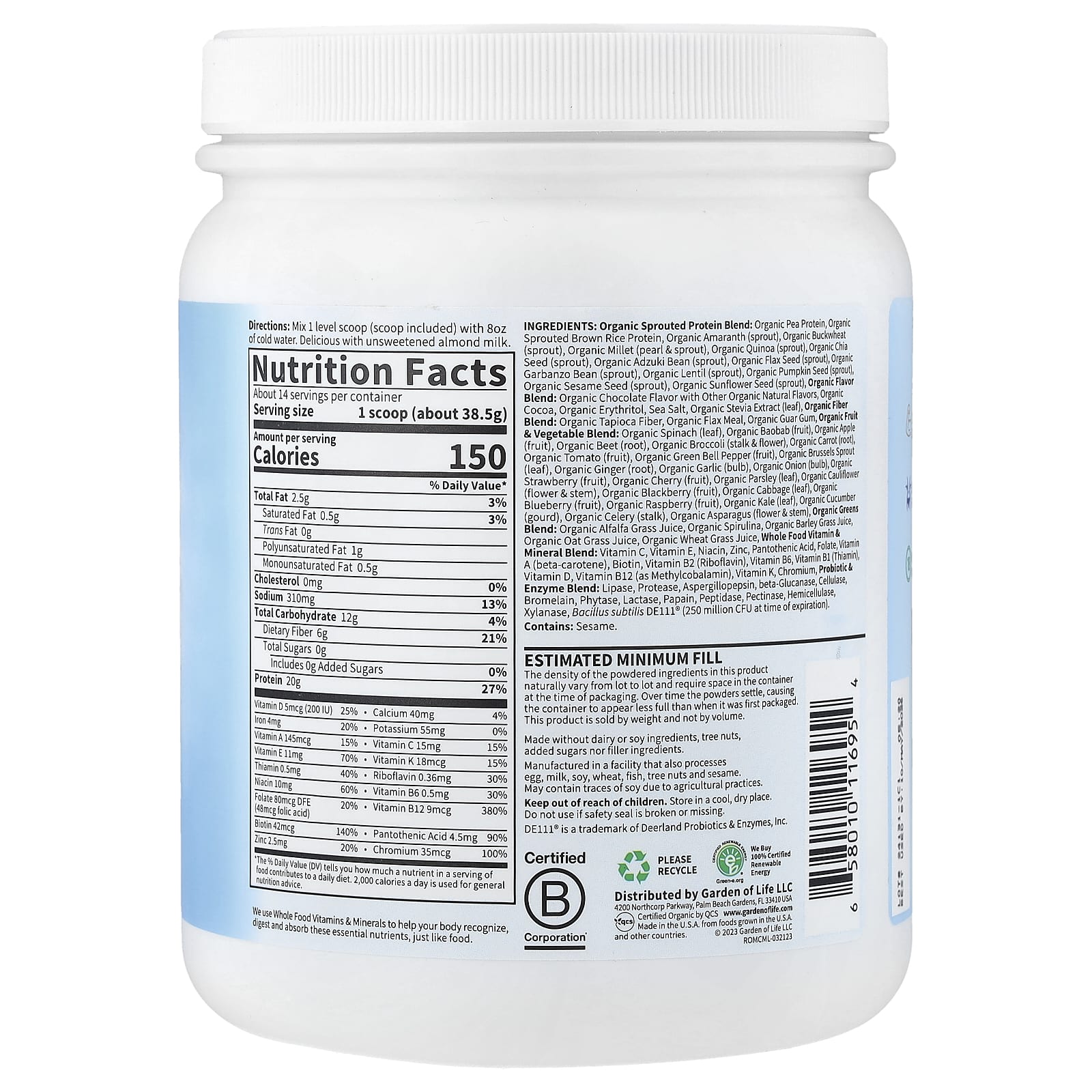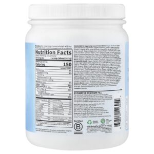 Mistura de proteína orgânica germinada: proteína de ervilha orgânica, proteína de arroz integral germinado orgânico, amaranto orgânico (broto), trigo sarraceno orgânico (broto), milhete orgânico (grão e broto), quinoa orgânica (broto), semente de chia orgânica (broto), feijão-azuqui orgânico (broto), semente de linhaça orgânica (broto), grão-de-bico orgânico (broto), lentilha orgânica (broto), semente de abóbora orgânica (broto), semente de gergelim orgânico (broto), semente de girassol orgânico (broto), mistura de sabores orgânicos: sabor de chocolate orgânico com outros sabores naturais orgânicos, cacau orgânico, eritritol orgânico, sal marinho, extrato de estévia orgânica (folha), mistura de fibras orgânicas: fibra de tapioca orgânica, farinha de linhaça orgânica, goma guar orgânica, frutas orgânicas e frutas; mistura de vegetais: espinafre orgânico (folha), baobá orgânico (fruta), maçã orgânica (fruta), beterraba orgânica (raiz), brócolis orgânico (talo e floretes), cenoura orgânica (raiz), tomate orgânico (fruto), pimentão verde orgânico (fruto), couve-de-bruxelas orgânica (folha), gengibre orgânico (raiz), alho orgânico (bulbo), cebola orgânica (bulbo), morango orgânico (fruta), cereja orgânica (fruta), salsinha orgânica (folha), couve-flor orgânica (talo e flores), amora orgânica (fruta), repolho orgânico (folha), mirtilo orgânico (fruta), framboesa orgânica (fruta), couve orgânica (folha), pepino orgânico (cabaça), aipo orgânico (talo), aspargos orgânicos (talo e floretes), mistura de verduras orgânicas: suco de grama de alfafa orgânica, espirulina orgânica, suco de grama de cevada orgânica, suco de grama de aveia orgânica, suco de grama de trigo orgânico, vitamina de alimentos integrais e mistura de minerais: vitamina C, vitamina E, ácido nicotínico, zinco, ácido pantotênico, folato, vitamina A (betacaroteno), biotina, vitamina B2 (riboflavina), vitamina B6, vitamina B1 (tiamina), vitamina D, vitamina B12 (como mecobalamina), vitamina K, cromo, probiótico & mistura de enzimas: lipase, protéase, aspergilopepsina, beta-glucanase, celulase, bromelaína, fitase, lactase, papaína, peptidase, pectinase, hemicelulase, xilanase, Bacillus subtilis de111″ (250 milhões de UFCs no momento do vencimento).