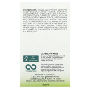 Água, glicerina, álcool desnat., dimeticona, isononyl isononanoate, carbômero, dimeticonol, clorfenesina, caprylyl glycol, hidróxido de sódio, fragrância, água da fruta vitis vinifera / água de uva, goma xantana, EDTA tetrassódico, acetato de tocoferol, ascorbyl glucoside, menthoxypropanediol, gliconato de magnésio, citrato de sódio, fenoxietanol, goma de biossacarídeo-1, gliconato de cálcio, ci 19140 / amarelo 5, CI 42090 / azul 1.