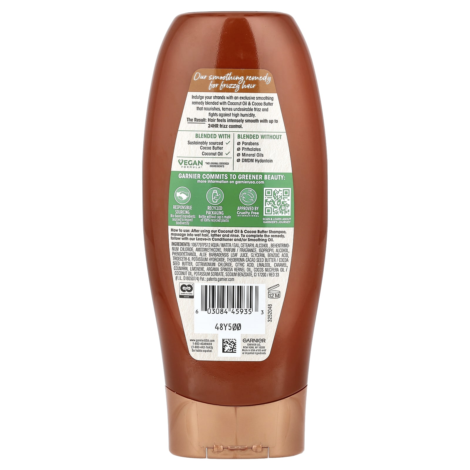 Água, álcool cetoestearílico, behentrimonium chloride, amodimethicone, perfume / fragrância, álcool isopropílico, fenoxietanol, suco da folha de Aloe barbadensis, glicerina, ácido benzoico, trideceth-6, hidróxido de potássio, manteiga da semente de Theobroma cacao/manteiga da semente de cacau, cetrimonium chloride, ácido cítrico, linalol, caramelo, cumarina, limoneno, óleo do grão de Argania spinosa, óleo de Cocos nucifera/óleo de coco, sorbato de potássio, benzoato de sódio, CI 17200/vermelho 33.