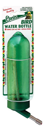 As garrafas Oasis Bird apresentam a ponta de bebida vermelho-cereja (uma bola de náilon vermelha inferior que atrai visualmente os pássaros e 2 bolas de aço inoxidável acima dela para aumentar o peso). Este tipo de tubo de bebida oferece um suprimento sanitário de água limpa que não é suja por cascas ou excrementos de sementes. A cor verde tradicional da garrafa protege o suprimento de água dos danos causados pela luz solar, preservando assim a potência de vitaminas e/ou medicamentos e inibindo o crescimento bacteriano. Uma bola branca flutuante indica rapidamente o nível da água. Cada garrafa serve entre 1 a 4 pássaros, dependendo da espécie e da dieta. Tamanho de 4 onças – geralmente usado para canários, tentilhões, periquitos (periquitos) e pombinhos.
