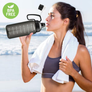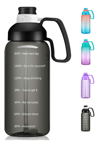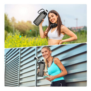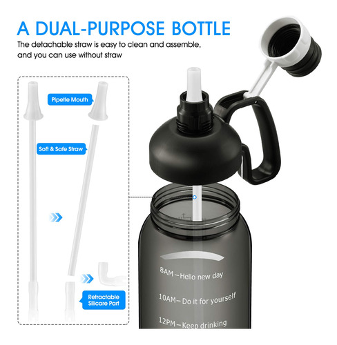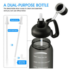 NOTE: Fill water up to the top, the capacity is 64oz(2 Liter). Safe Material: High quality food grade eco-friendly Tritan plastic, 100% BPA free, odour free and healthy for your daily water drinking. Large Capacity: 64oz about half gallon(2 Liter), large water bottle will give you enough to drink after your workout. Wide Mouth: A large wide mouth design is easy to clean, also it is easy to fits ice cubes and fruit. The large water bottle is lightweight and leakproof. It can be easily carried to outdoor activities. Warm Tips: Not resistant to fall, Not for dishwasher, only hand wash. Any problems (leak, break, dislike, ect) please contact us, lets provide you with a satisfactory solution. The number code 7 at the bottom of the water bottle refers to materials other than the six other materials such as PP and PET, including PC, TRITAN, PPSU and other materials. Our water bottle is made of TRITAN, which is also one of the No. 7 plastics. TRITAN is a new safe plastic material. It is BPA free. Please note: the number 7 includes PC and others, not just PC, and TRITAN is one of the others. – Motivational Water Bottle – Functional Everything Into One64 oz water bottle with removable straw, motivational time marker, ounce line & large size handle, more motivated help you to drink more, faster and easier, easy monitor your daily water intake every moment, easy carry; with ultra-wide mouth to help you put any size fruits add flavor to help you become a big water drinker to achieve health, beauty, and handsome goals. – Easy to Use & Multiple Color ChoicesSuper wide mouth water bottle make it very easy to fill ice cubes/fruits or easy to clean every corner with your hand in or brush. With easy drink straw, easy track clear measurement scales. Its a perfect water bottle. Plus with human design durable big handle let carrying around become fitness enjoyable. There is a variety of classic & modern colors options thats ideal for your beloved, friends, family, pregnant. – Leak Proof & BPA Free Big Water BottleEco-friendly plastic water jugs for drinking come with 100% BPS/BPA free, made of Tritan plastic to have safe drinking. There are dual ways of opening lids that can make sure close tightly so that 100% leak-proof & dust-proof. Its durable that has a great crack-proof but still be careful to use because its not made of stone. But if some bottle leak, break, or missing part. Please contact us to get a replacement. – Large Water Bottle Meet Daily Water Intake64 oz/ half gallon large capacity will accept your work all day and help you keep hydrated all day, dont need to refill again just meet your daily water needs. A great water bottle beat plenty of single-use bottled water to help you save money, save time ad save the planet. Its also ideal for indoor sports & outdoors exercise, great work for home, office, gym, hospital or school. – Widely Used & 100% After-Sales Warranty1/2 gallon reusable portable infuser gym water bottle ideal workout fitness gifts. Great for hiking, camping, running, fishing, climbing, and cycling for your wonderful life. If you have any issues or problems with our bottles, like, leaks, cracks, missing parts, unsatisfied, etc. Please let us know, and contact the Podocarpus seller on Amazon, we are here for you any time. Rinse with baking soda or white vinegar before use.