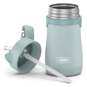 Esta garrafa de canudo de aço inoxidável THERMOS BABY é ótima para crianças (maiores de 18 meses) que estão saindo da mamadeira e aprendendo a beber em uma xícara. O frescor e a segurança andam de mãos dadas, e é por isso que esta garrafa de canudo de aço inoxidável possui a tecnologia de isolamento a vácuo THERMOS para manter a bebida gelada de seus filhos por até 12 horas. A garrafa de canudo de aço inoxidável isolada a vácuo tem um corpo contornado fácil de segurar, feito especificamente para mãos pequenas. A garrafa de canudo de aço inoxidável mantém as bebidas geladas. Você pode colocar o copo e a tampa da garrafa de canudo de aço inoxidável THERMOS BABY na prateleira superior da máquina de lavar louça; no entanto, é recomendável lavar à mão. Não deve ser usado com líquidos quentes.