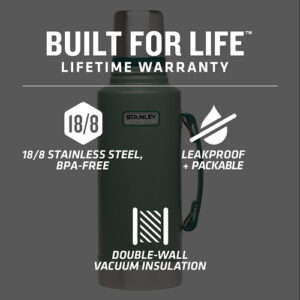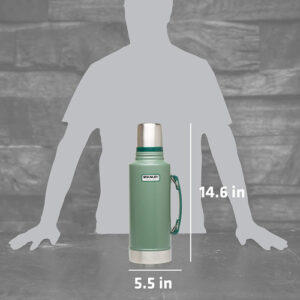 Garrafa de boca larga isolada a vácuo Stanley Classic – Garrafa térmica de aço inoxidável 18/8 sem BPA para bebidas frias e frias mantém os líquidos quentes ou frios por até 24 horas. Mantenha-a quente ou fria: nossa garrafa a vácuo Stanley Classic é feita com isolamento superior que mantém líquidos (sopa, café, chá) quentes ou frios por até 24 horas. Também é feita com materiais sem BPA, mantendo seu conteúdo seguro de consumir – RESISTENTE E DURÁVEL: O A construção em aço inoxidável 18/8 à prova de ferrugem nesta garrafa térmica isolada significa que ela pode trabalhar tão duro quanto você sem impactá-la desempenho Esta é uma garrafa ideal para jogar em seu caminhão, bolsa de trabalho ou viajar com ela – TAMPA MULTIUSO: A garrafa térmica Stanley foi projetada com uma tampa resistente a vazamentos, para que você possa colocá-la na mochila sem se preocupar com derramamentos. A boca larga da garrafa térmica ajuda a colocá-la facilmente na tampa que funciona como um copo de oito onças. Material térmico: aço inoxidável. – ENCHA-A PARA O DIA: Nossa garrafa a vácuo vem em vários tamanhos: 1, 1 qt, 15 qt e 2 qt, para que você possa enchê-la com água uma vez e configurá-la pelo tempo que precisar. A alça dobrável facilita o transporte com você – Dimensões: 4,5 L x 5,5 L x 14,6 A pol