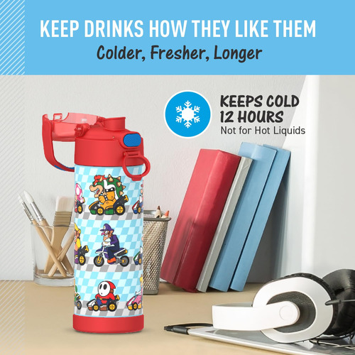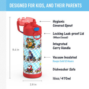 Garrafa isolada a vácuo de aço inoxidável THERMOS FUNTAINER de 16 onças com tampa de bico largo, Mario – PERMANECE FRIA: a tecnologia de isolamento a vácuo THERMOS mantém as bebidas frias por até 12 horas. Nossas garrafas de água para crianças são construídas de forma que suas bebidas sejam tão frescas por dentro quanto por fora. Não é adequado para líquidos quentes — DURÁVEL PARA USO DIÁRIO: A construção em aço inoxidável 18/8 de alta qualidade foi construída para lidar com quedas, amassados e diversos compartimentos de desbaste. Você pode colocar sua garrafa de água FUNTAINER na lava-louças, embora seja recomendável lavá-la à mão. Design adequado para crianças: escolha entre uma variedade de cores e padrões divertidos! Esta garrafa de água é leve e compacta com uma tampa de botão, por isso é fácil de transportar e abrir. A alça de transporte integrada possui uma alça de toque suave – BICO HIGIÊNICO COBERTO: ajude a manter os germes afastados com um bico higienicamente coberto – PROTEJA O QUE VOCÊ ADORA: este equipamento THERMOS KIDS é feito com materiais duráveis que podem ser lavados na máquina de lavar louça, destinados a manter o almoço e as bebidas como eles gostam. O quebra-cabeça da hora do almoço está oficialmente resolvido